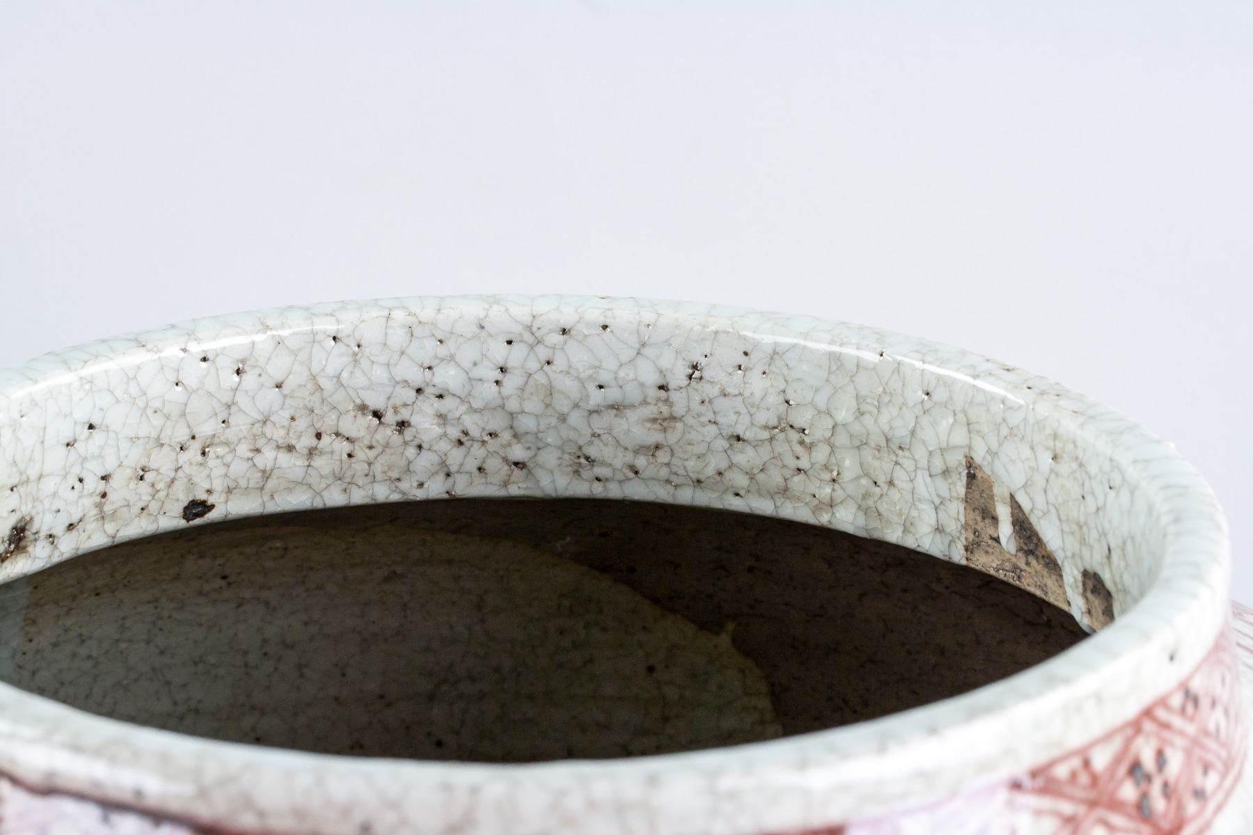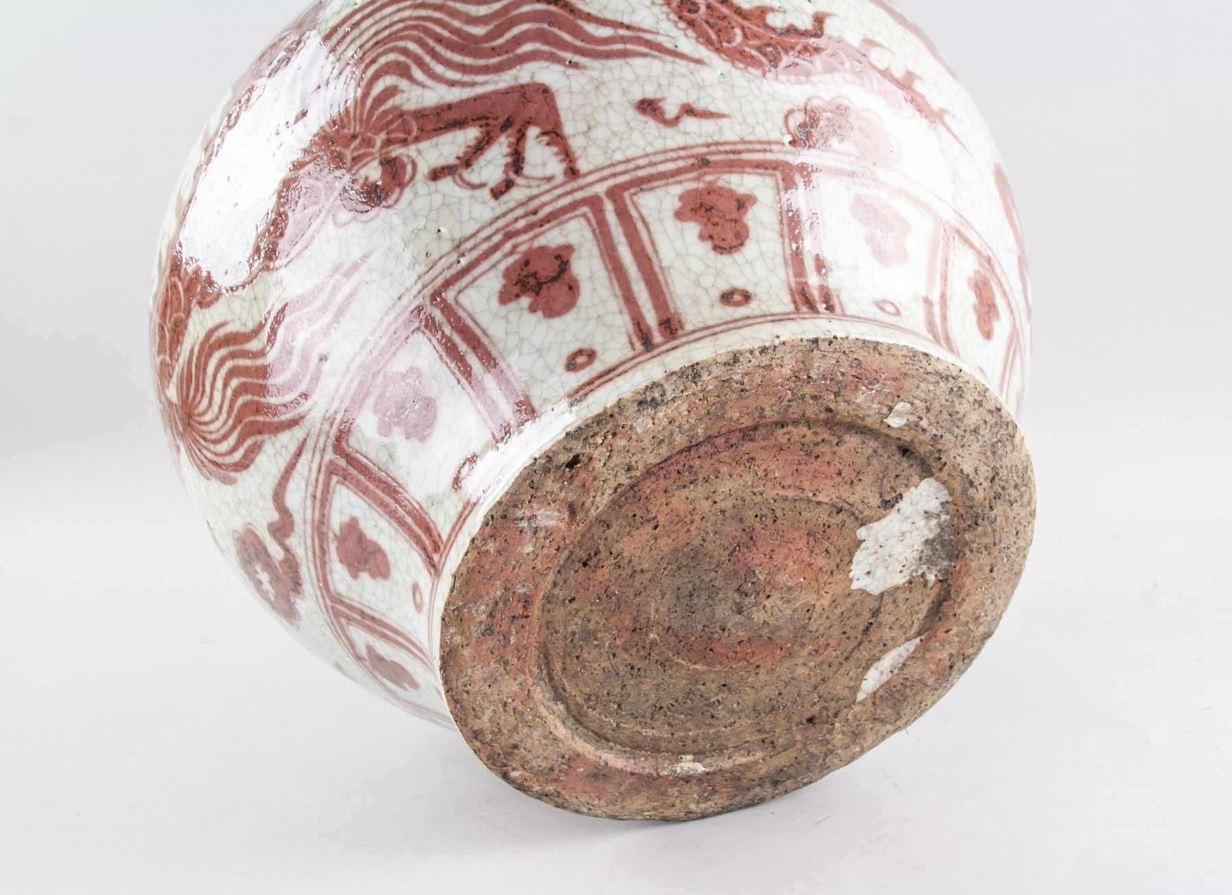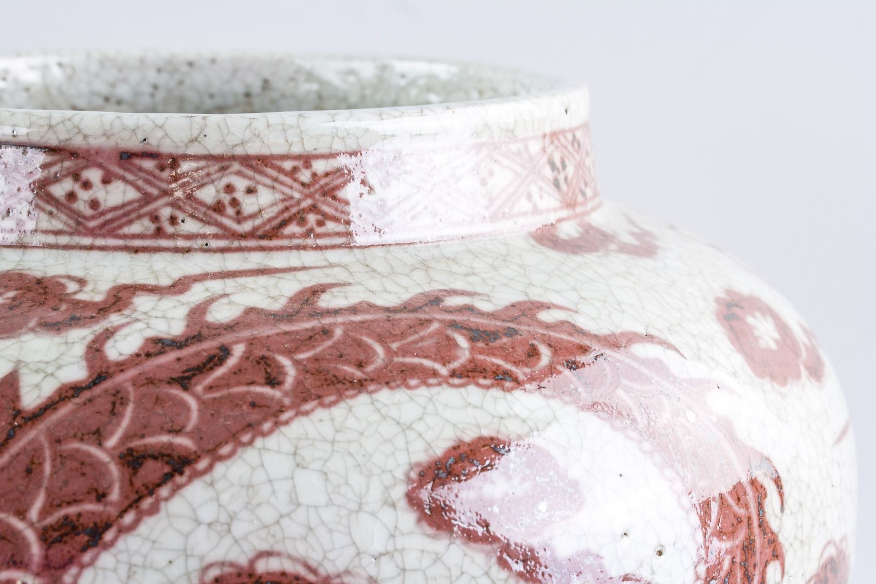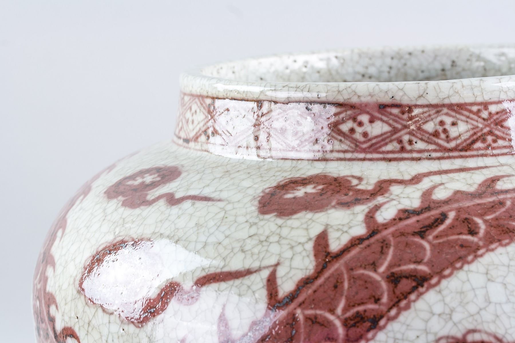 Chinese Yuan/Ming style copper red porcelain jar; of globular body, tapering to bottom; painted with dragon and fireballs; decorated with geometric patter; covered by crackle glaze; 29 x 32 cm, 5 kilograms