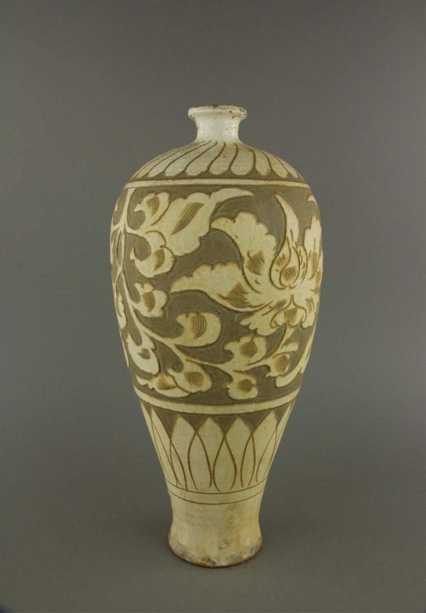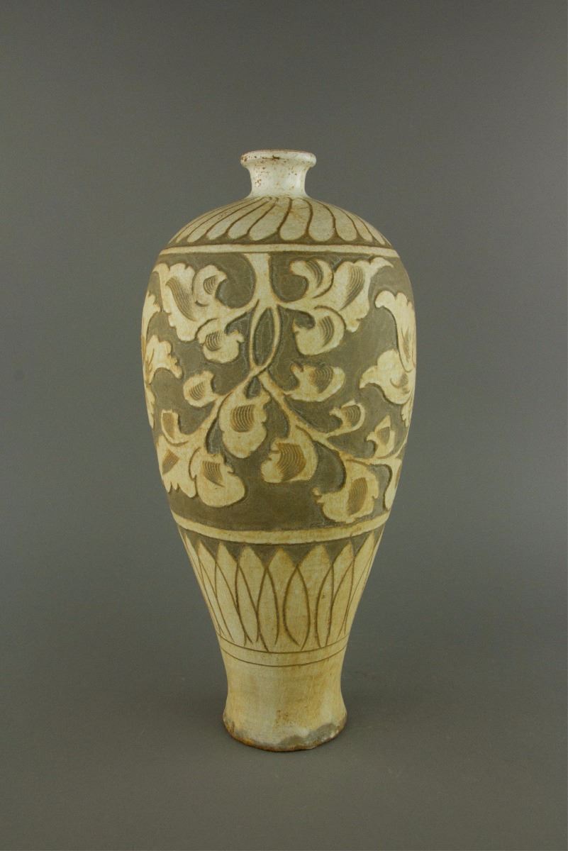 Chinese Yuan or Ming style porcelain vase; of ovoid body tapering to the bottom; incised with leafy floral scroll; H: 35 cm, D: 15 cm, 1914 grams