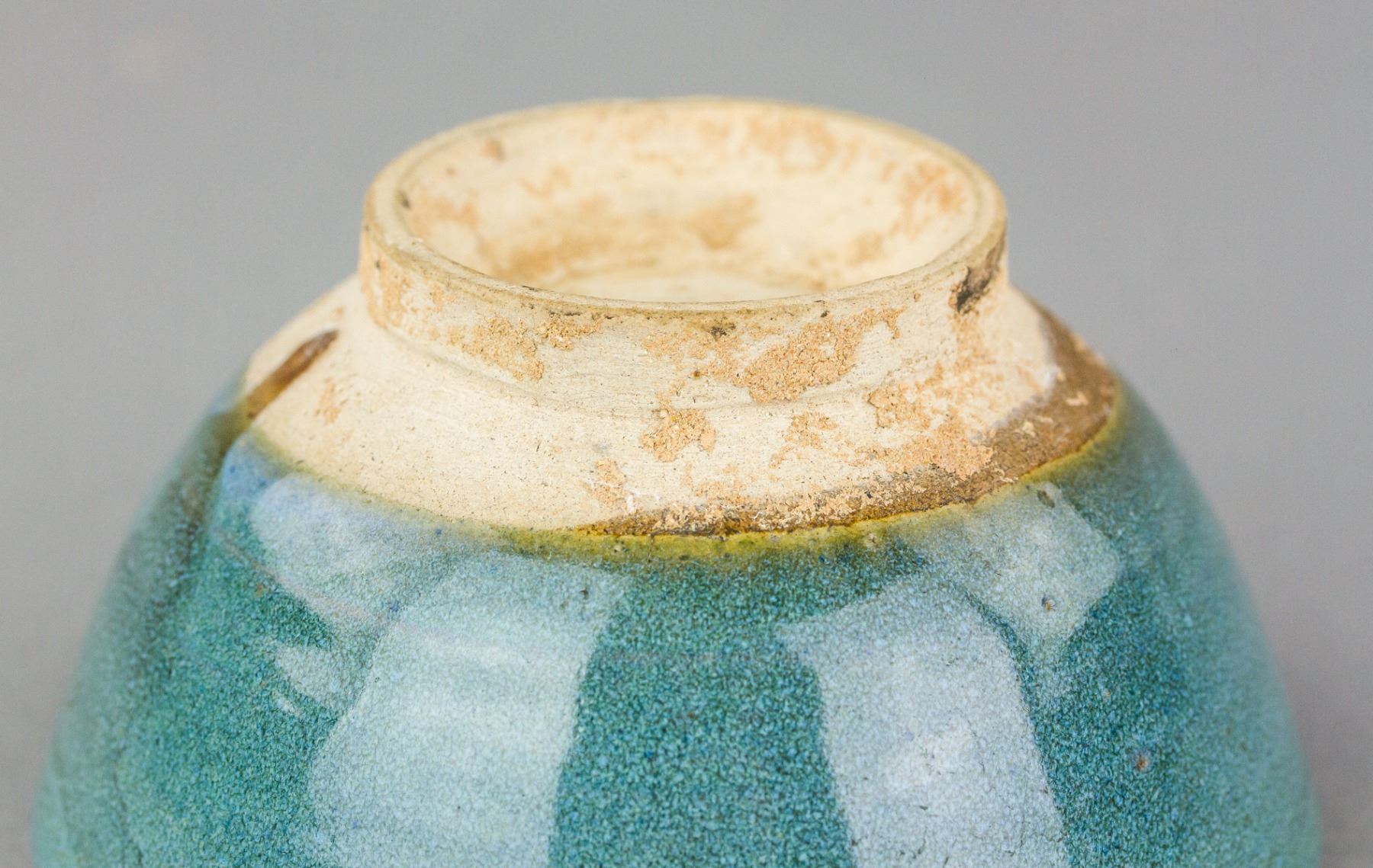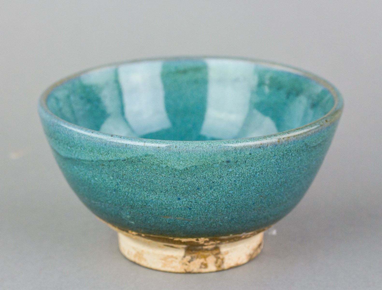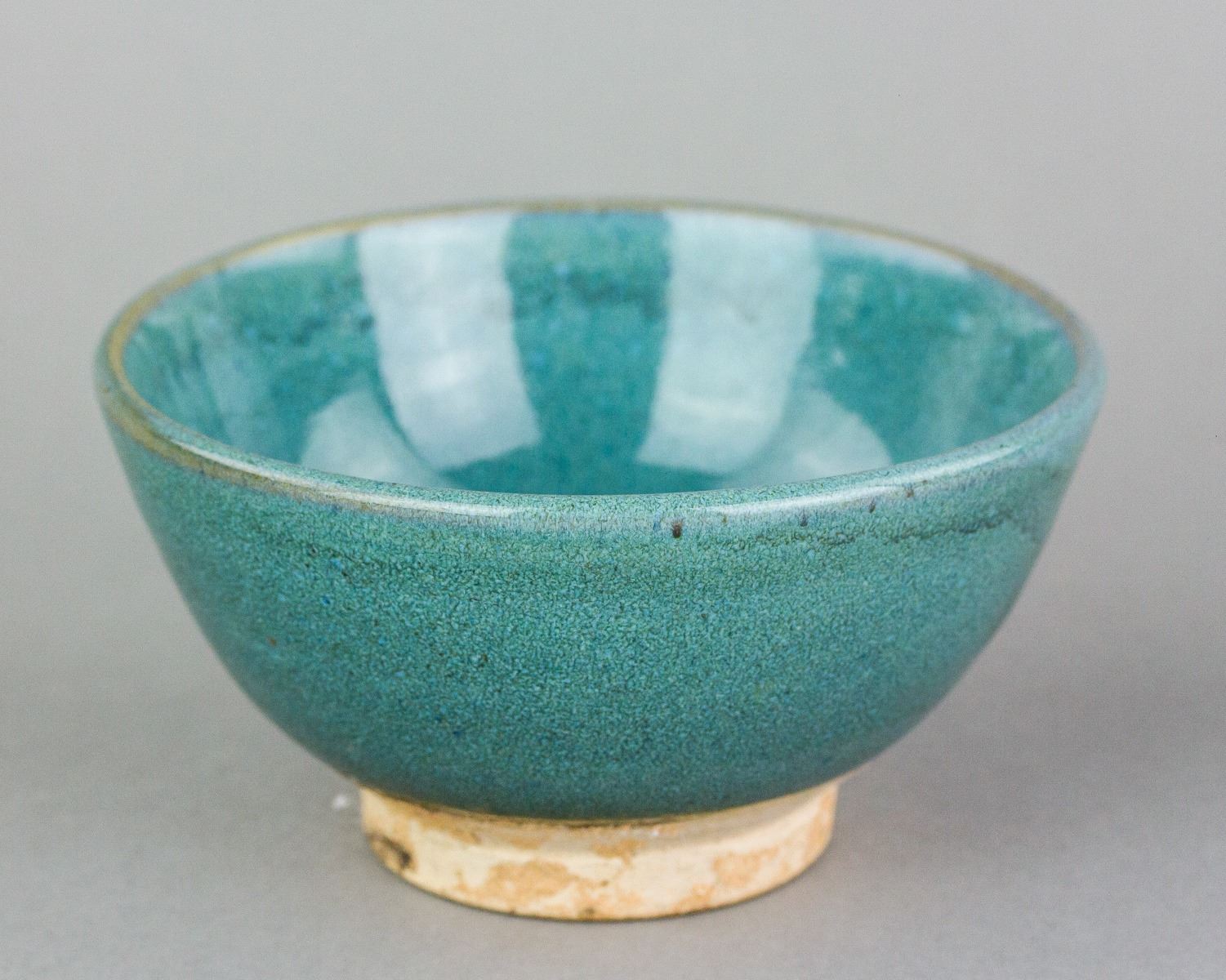 Chinese Junyao porcelain bowl, Yuan style; of deep rounded sides on bare short foot; covered in mottle turquoise glaze; H: 5.8 cm, D:10.5 cm,181 grams