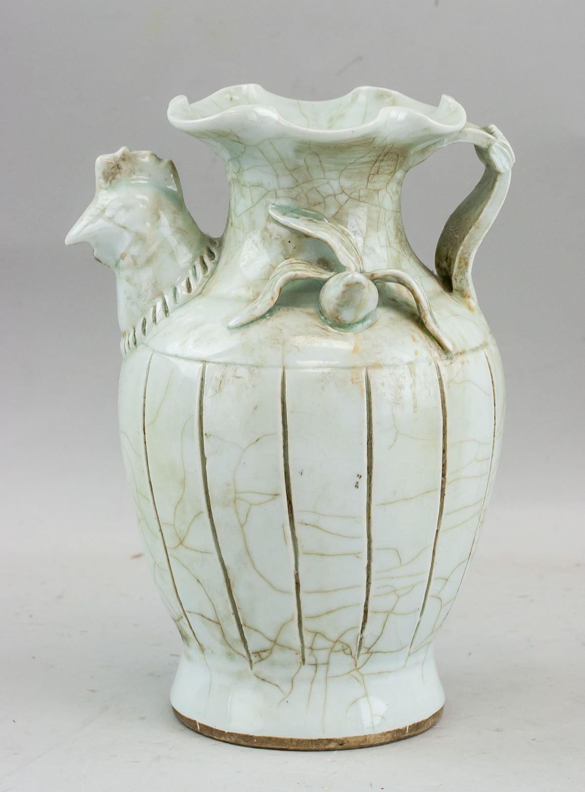 Chinese Yuan style celadon porcelain pot. Featuring lobed ovoid form body. With chicken head spout. Carved with peach on shoulder. 21 x 10 cm, 1085 grams