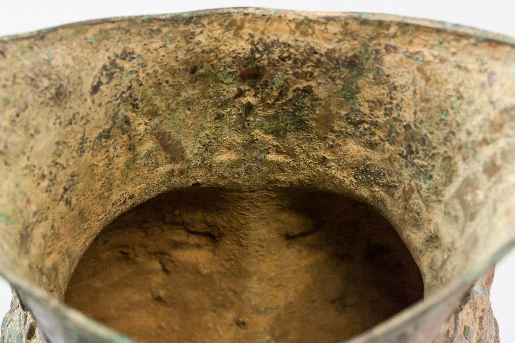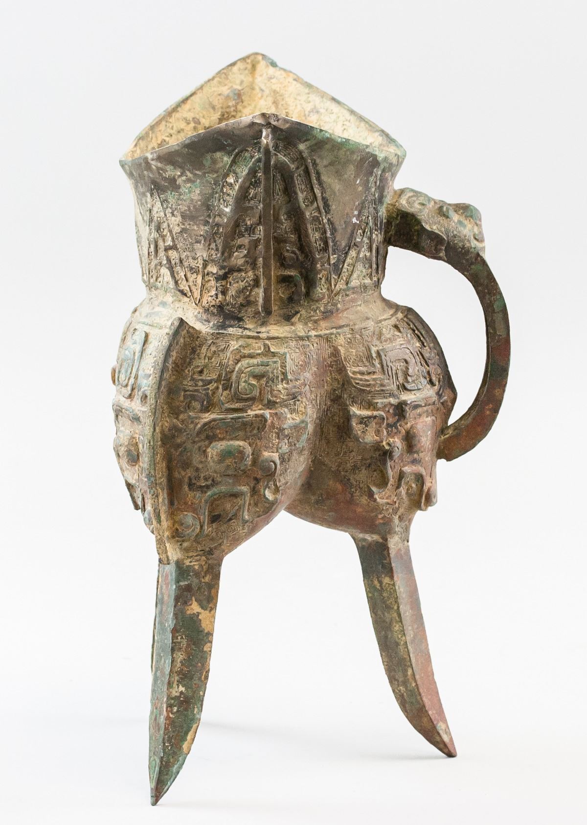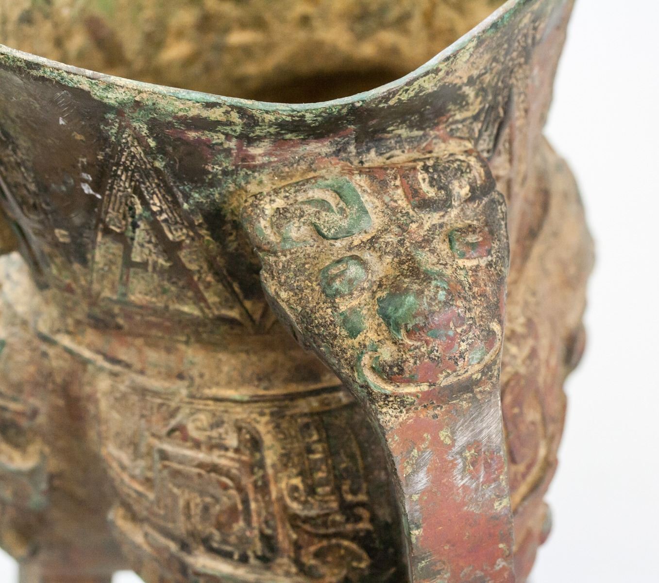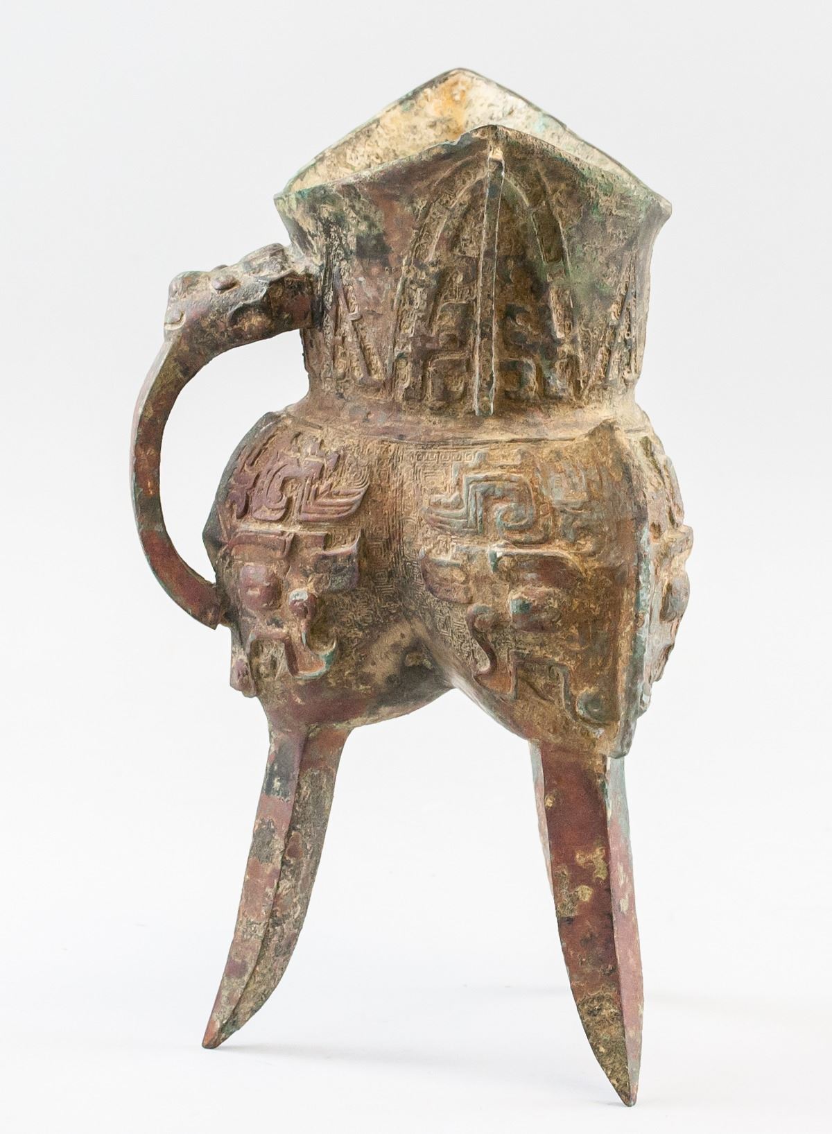 Chinese bronze tripod drinking vessel. Possibly from the Zhou dynasty. Metal composition reading states: Fe: 0.402, Cu: 77.34, Sn: 14.22, Sb: 0.517, Pb: 7.28. 28 x 16 cm, 1489 grams.