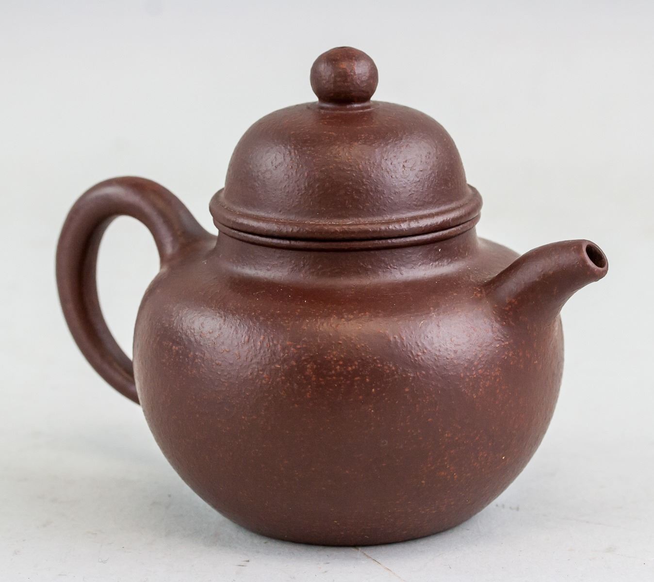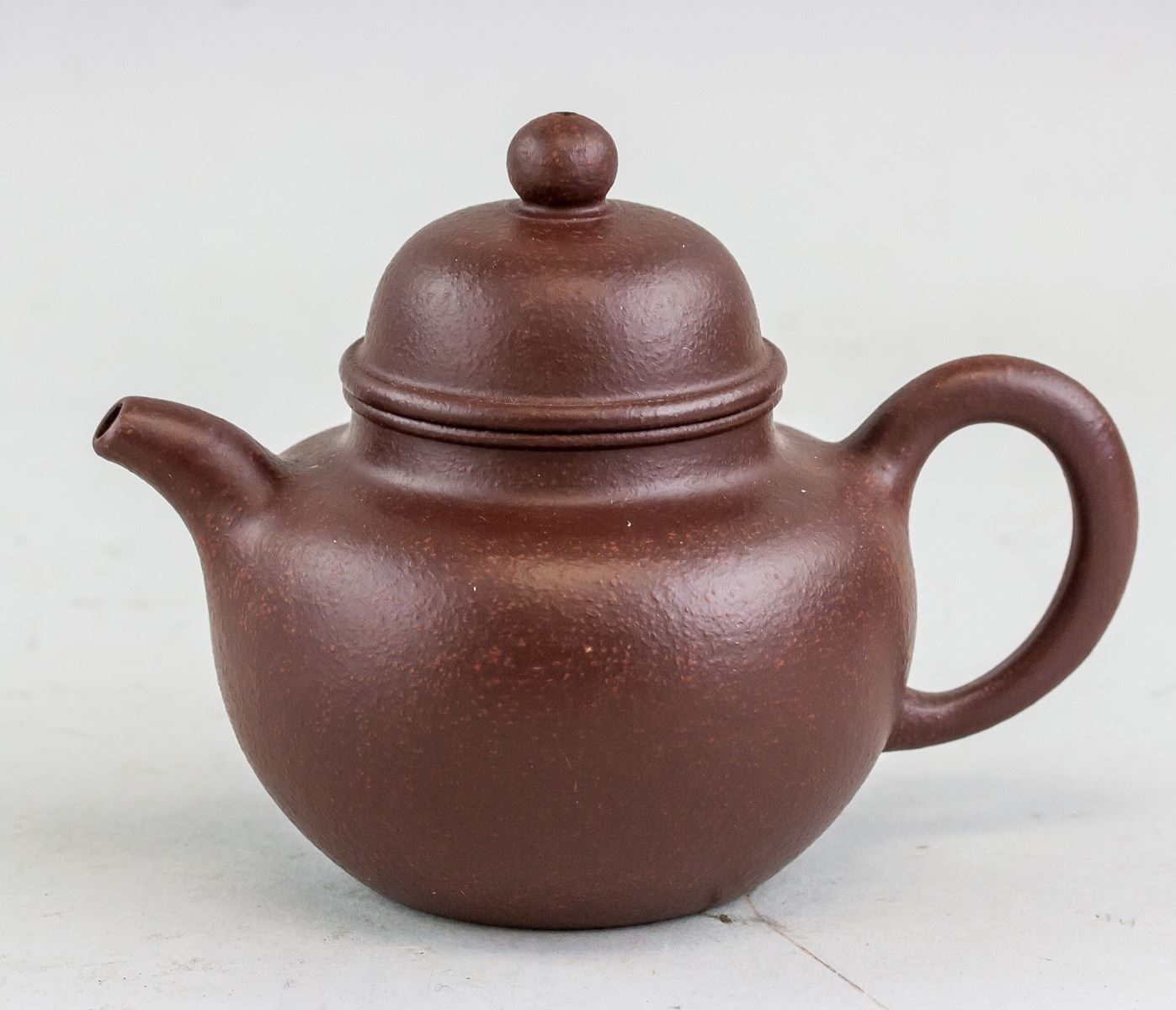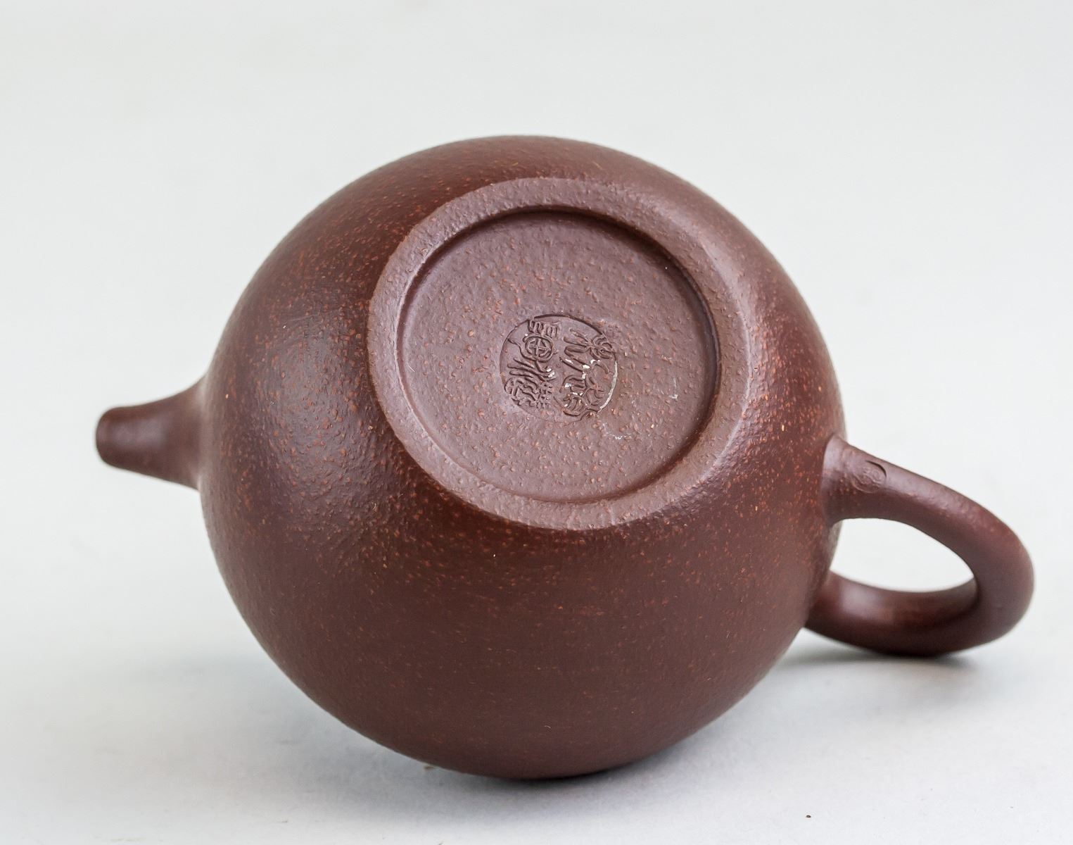 Chinese 20th century Zisha pottery teapot. Of globular body. Flanked with curved spout and handle. 2 artist mark under lid, 1 artist mark under handle, 1 artist mark Zhao Qian Zhi Tao on base. 10 x 15 cm, 199 grams
