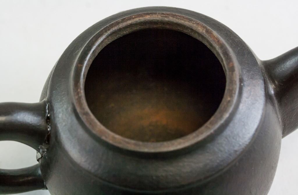 Chinese zisha teapot with happy Buddha. Of dark brown tone. With short spout and rounded handle. With four character mark on base. With stamp on top of lid. 8 x 15 cm. 279 grams.8 x 15 cm. 279 grams.