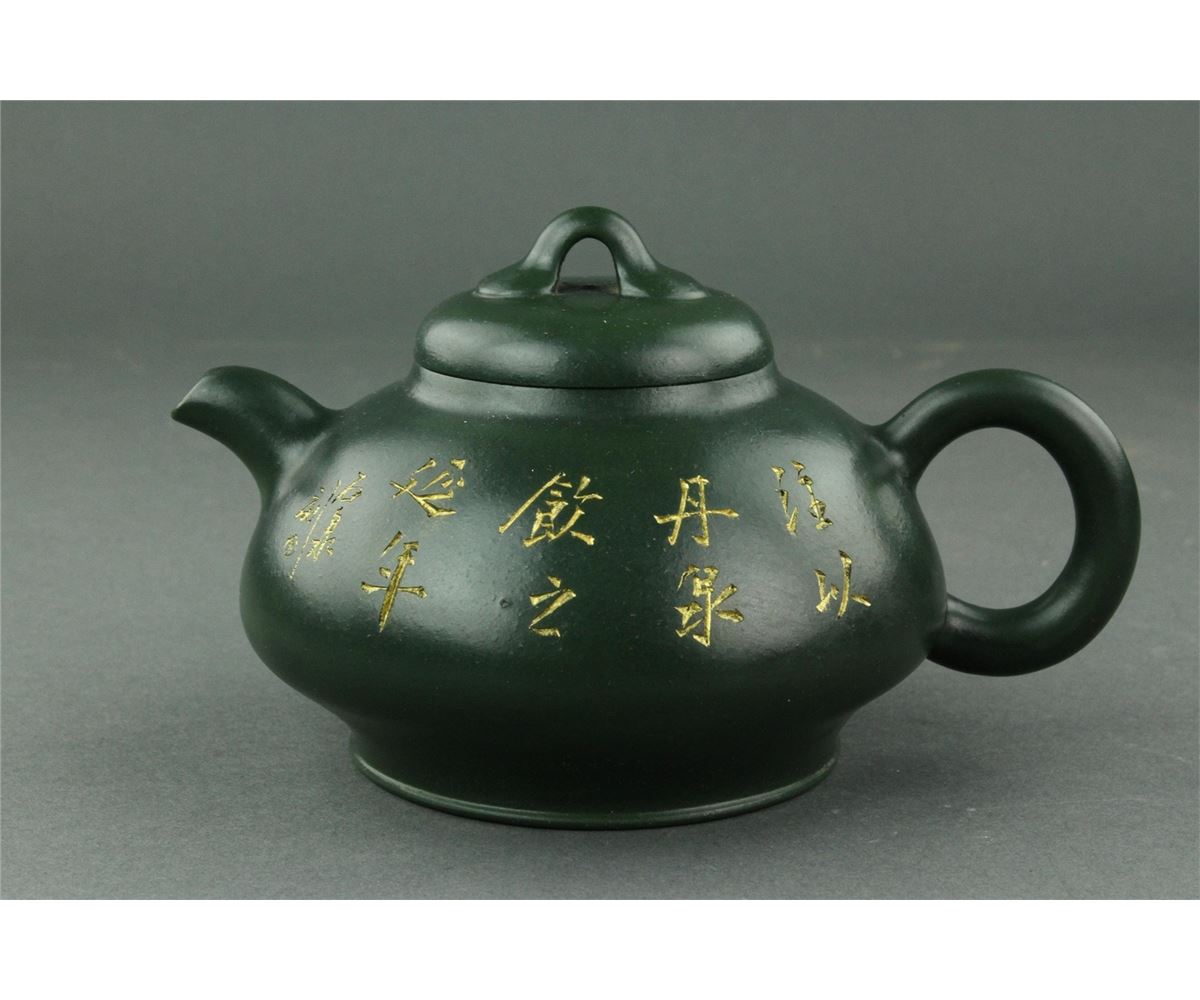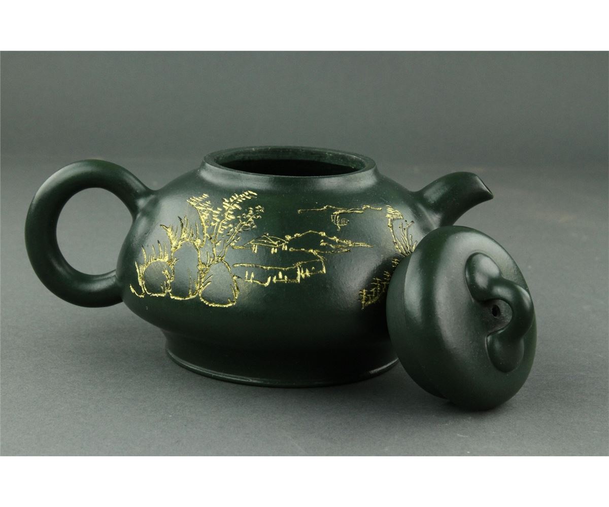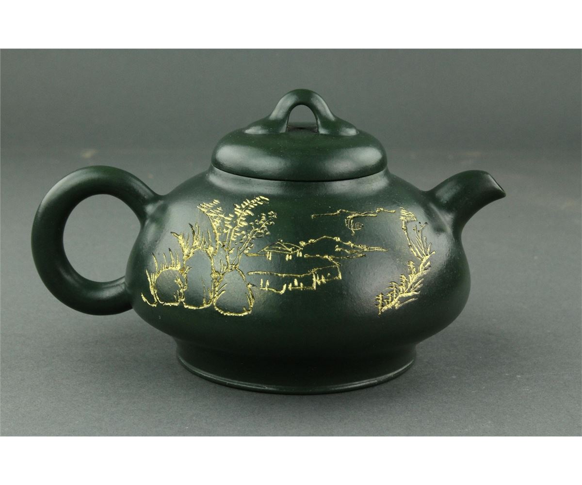 Chinese Zisha teapot; featuring gilt carvings of landscape and calligraphy on body; of dark green tone; with artist seal on base and handle; H: 9 cm, W: 17 cm, 374 grams