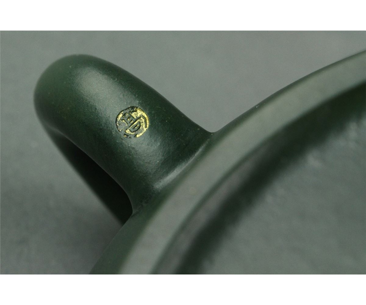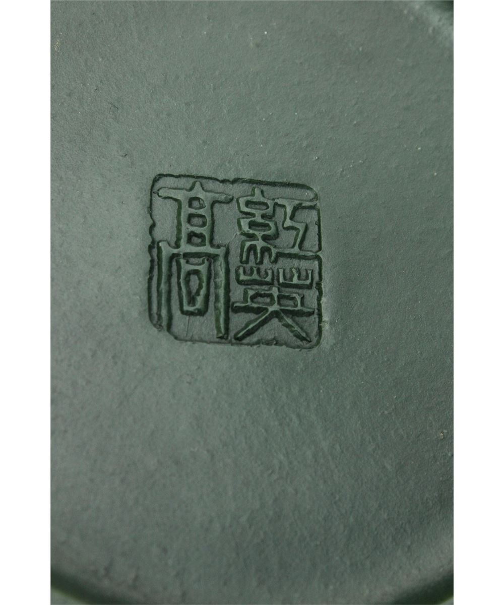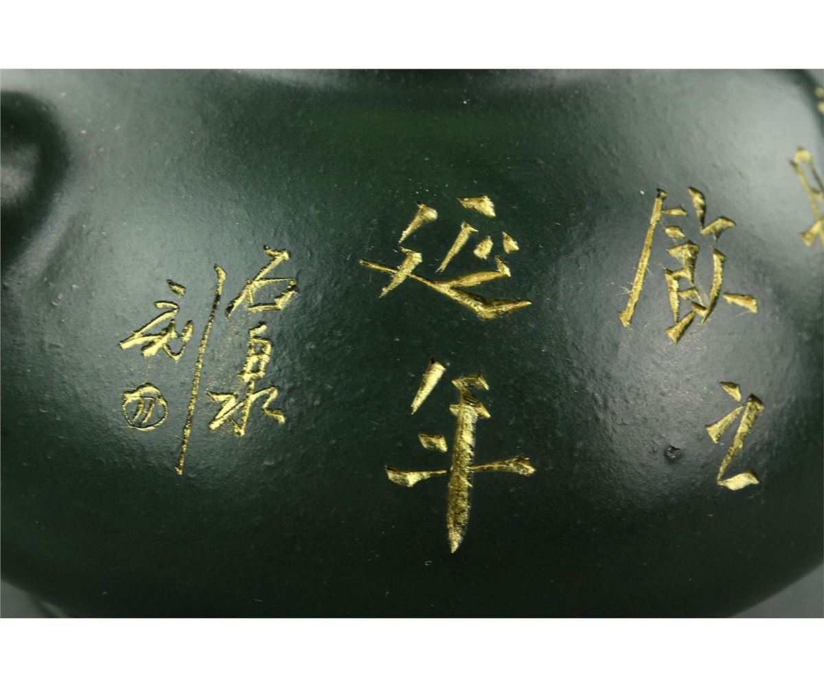 Chinese Zisha teapot; featuring gilt carvings of landscape and calligraphy on body; of dark green tone; with artist seal on base and handle; H: 9 cm, W: 17 cm, 374 grams