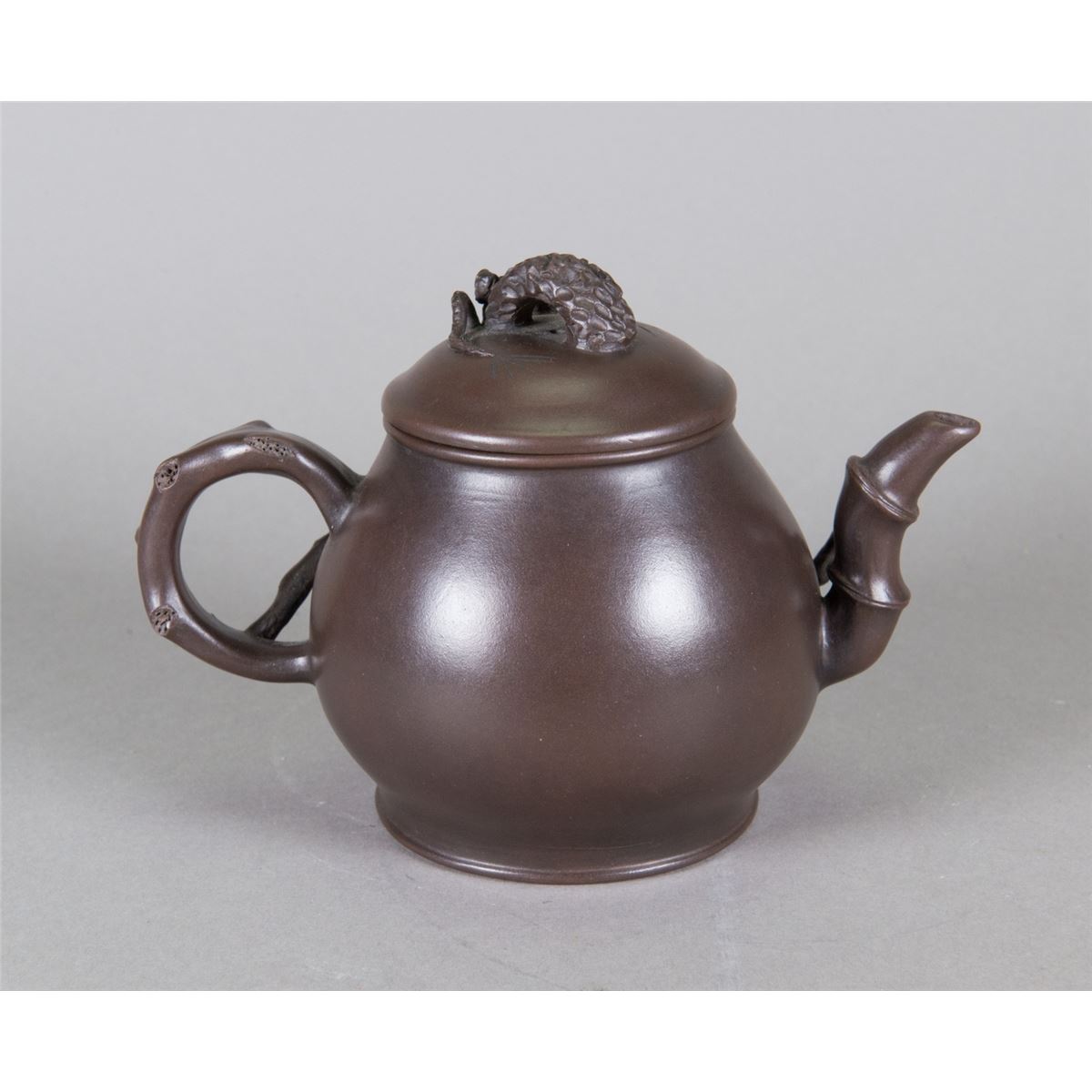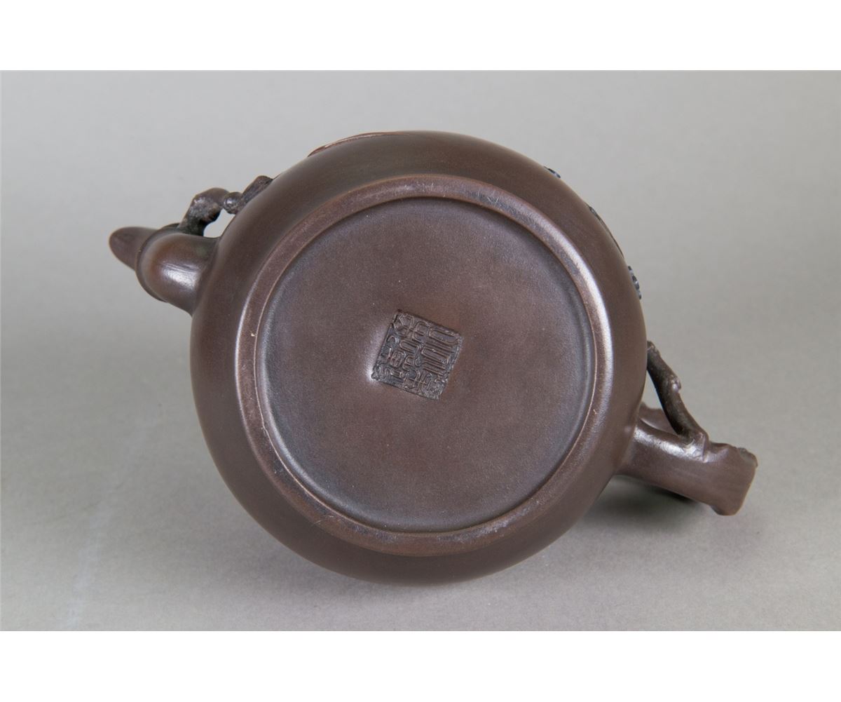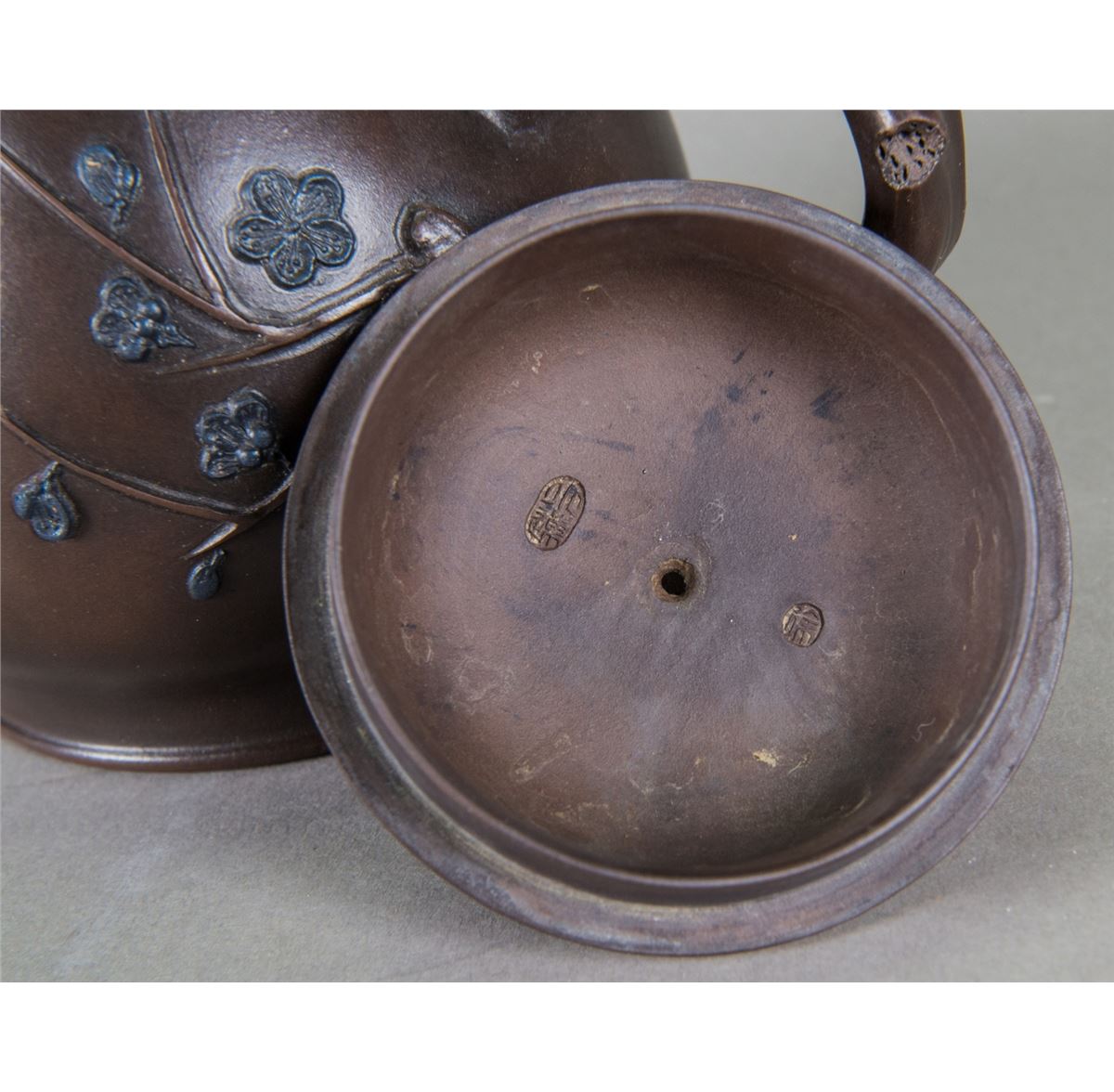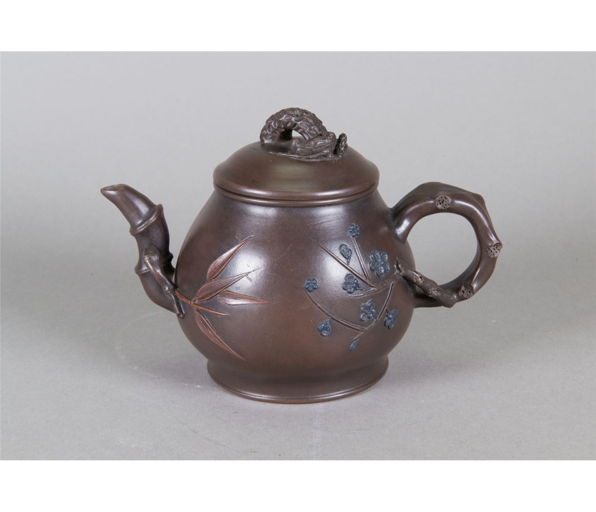 Chinese Zisha teapot; of globular body with plum blossom branch handle and bamboo spout; H: 13 cm, W: 22 cm, 472 grams