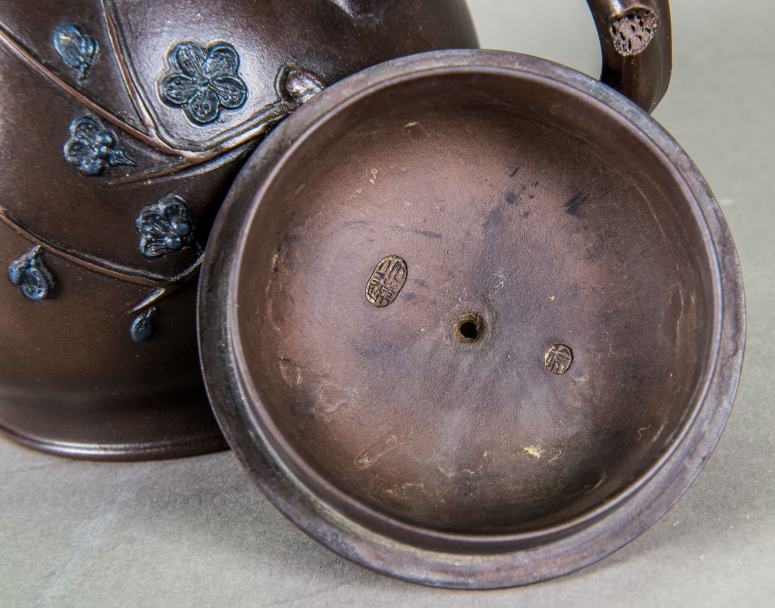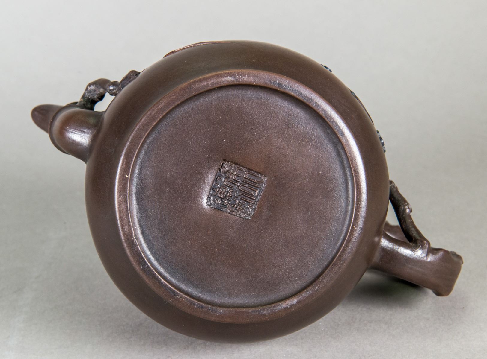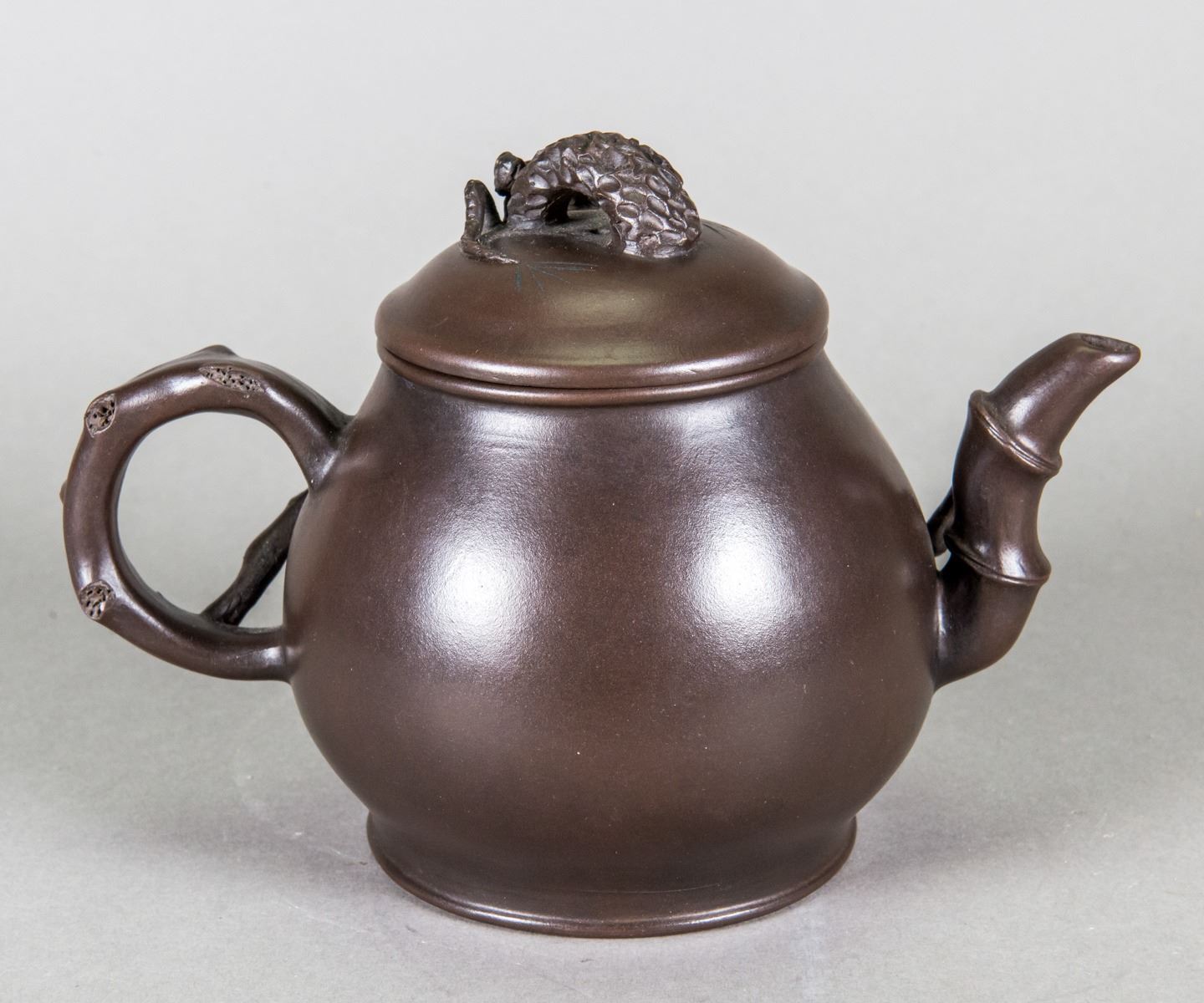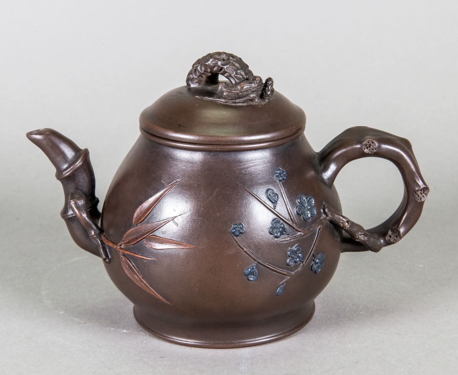 Chinese Zisha teapot; of globular body with plum blossom branch handle and bamboo spout; H: 13 cm, W: 22 cm, 472 grams