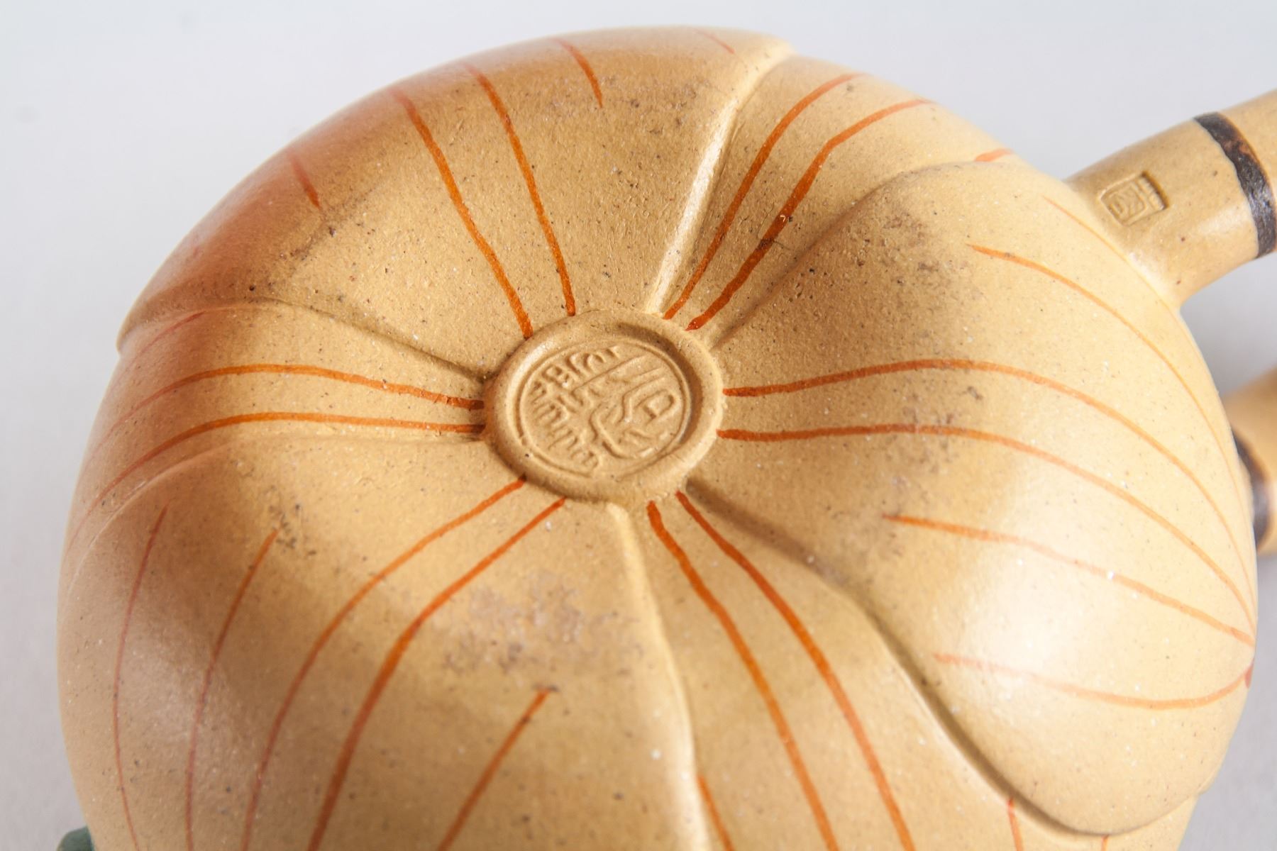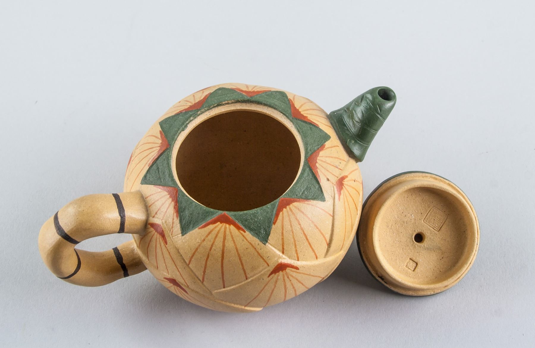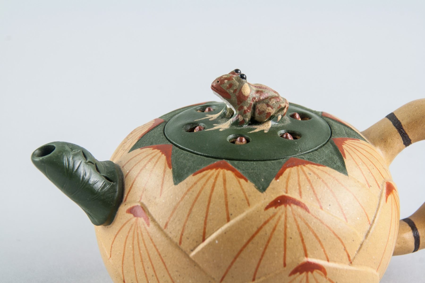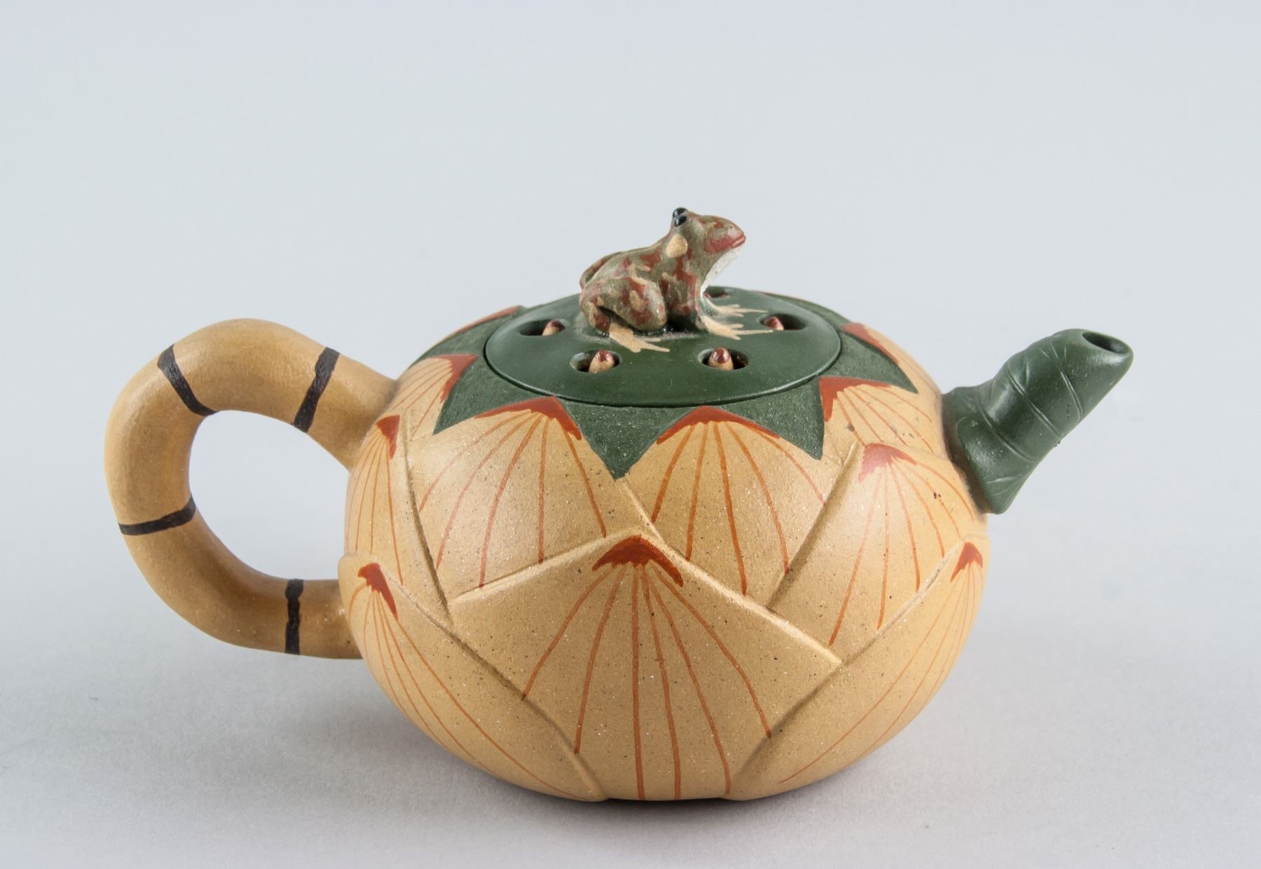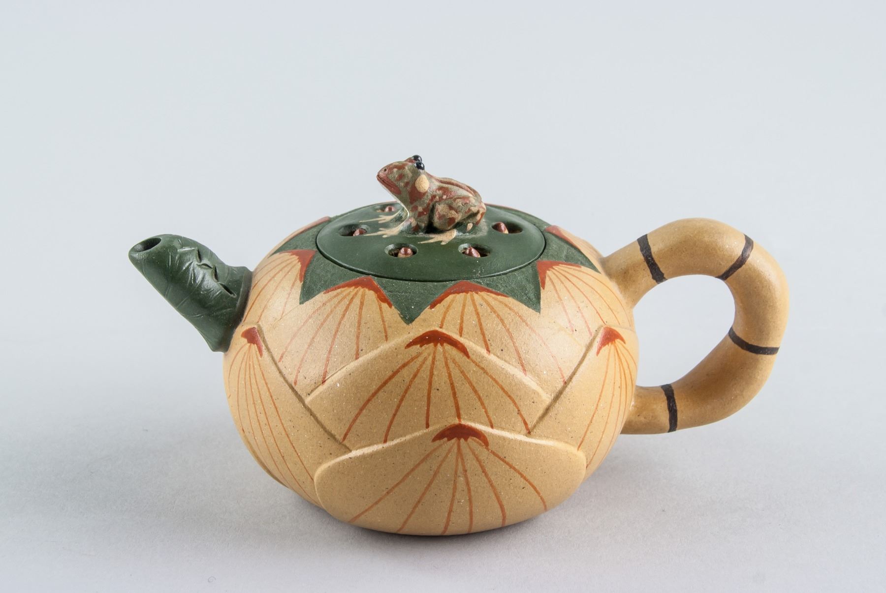Chinese Zisha teapot; of compressed globular body; flanked with two short curved spout and handle; carved with lotus pedal on surface; cover of lotus shape with a frog on top; with two artist marks inside of cover, one on the base, under the handle; artist name Jiang Rong (1919-2008); H: 5 cm, W: 13 cm, 176 grams