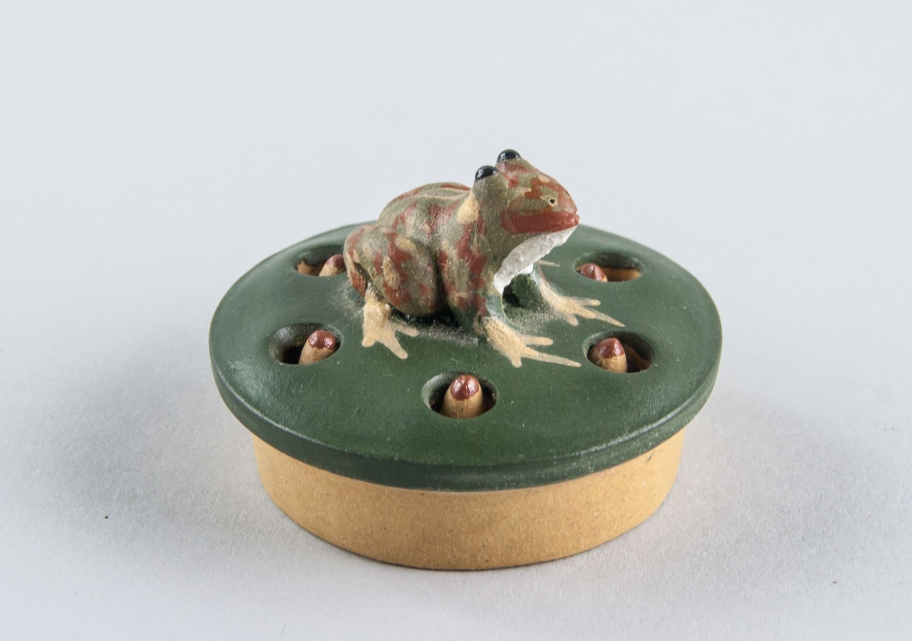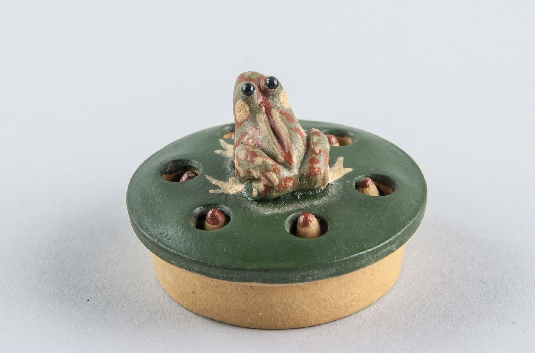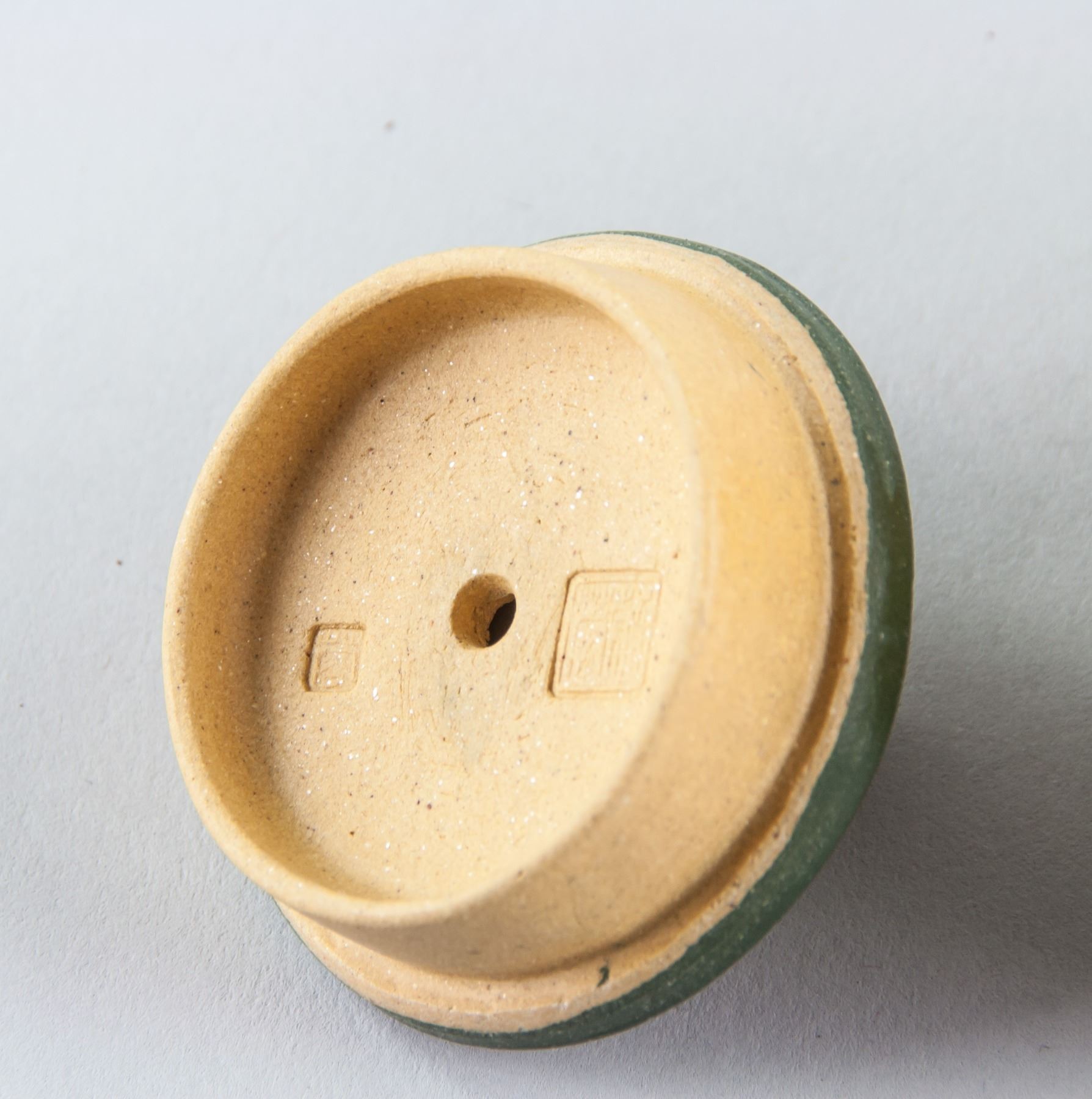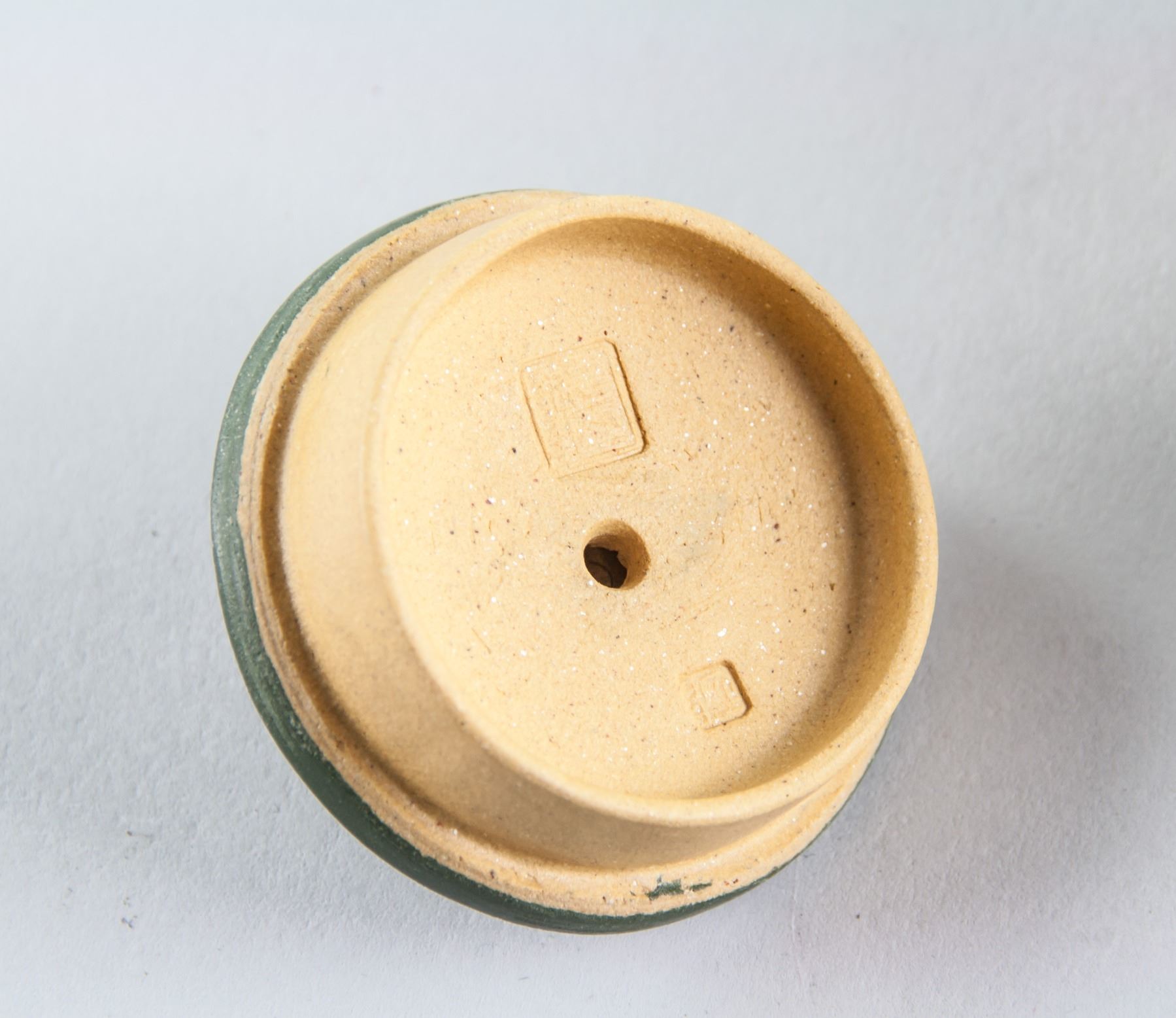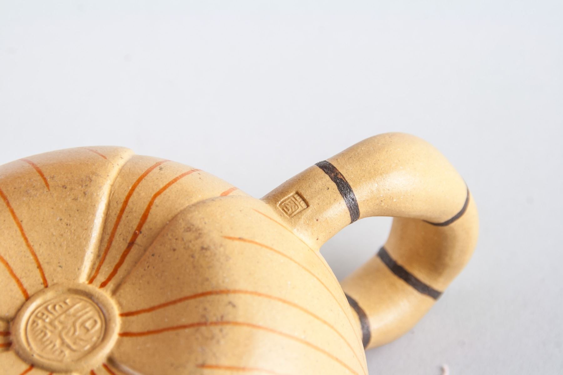 Chinese Zisha teapot; of compressed globular body; flanked with two short curved spout and handle; carved with lotus pedal on surface; cover of lotus shape with a frog on top; with two artist marks inside of cover, one on the base, under the handle; artist name Jiang Rong (1919-2008); H: 5 cm, W: 13 cm, 176 grams