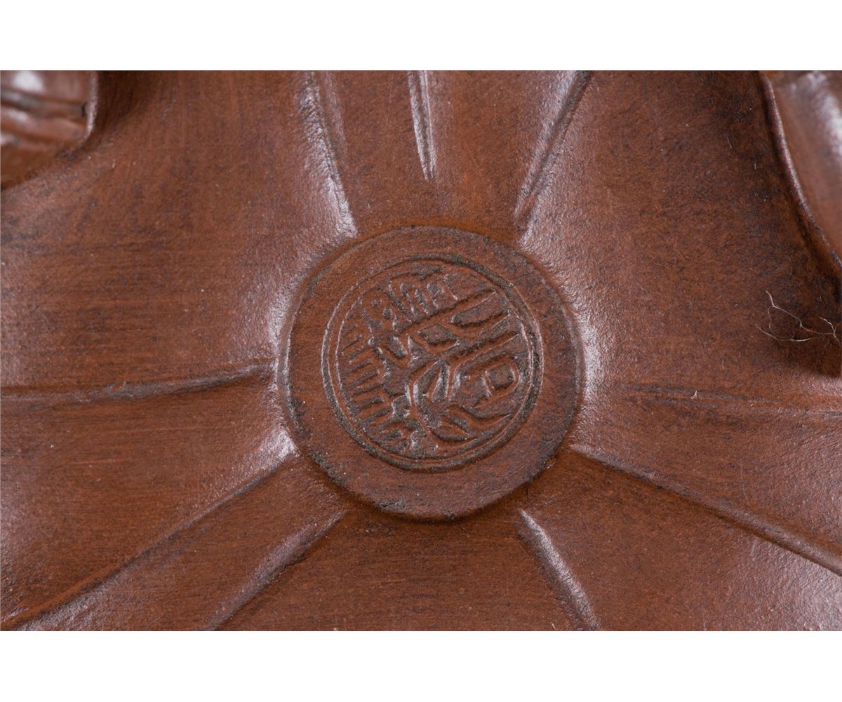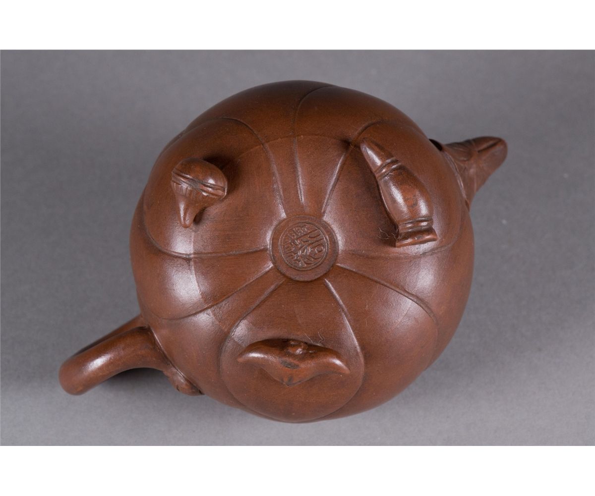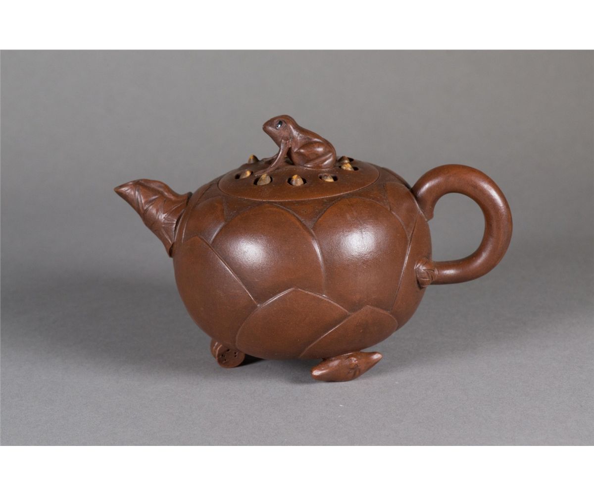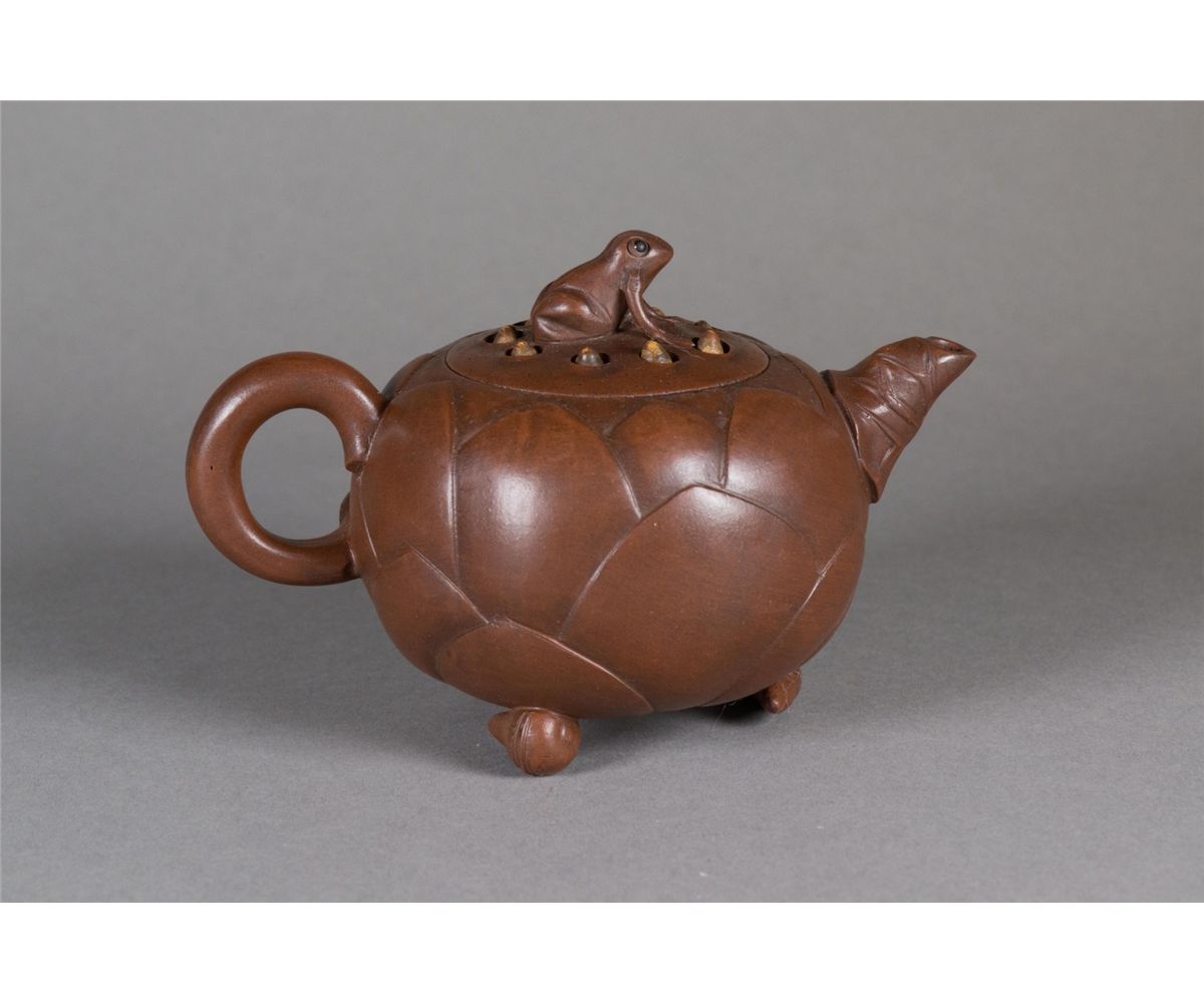 Chinese Zisha teapot; of lotus form with lotus seedpod-shaped lid; artist stamps on lid and bottom; H: 11 cm, 381 grams