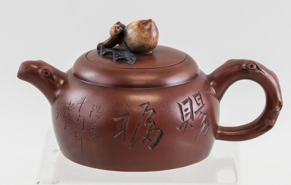 Chinese zisha teapot. Of reddish brown tone. Carved with calligraphy. Lid deocrate with peach. With turtle-head spout and round handle. Seal on base. H: 8 cm. W: 18 cm. 263 grams.