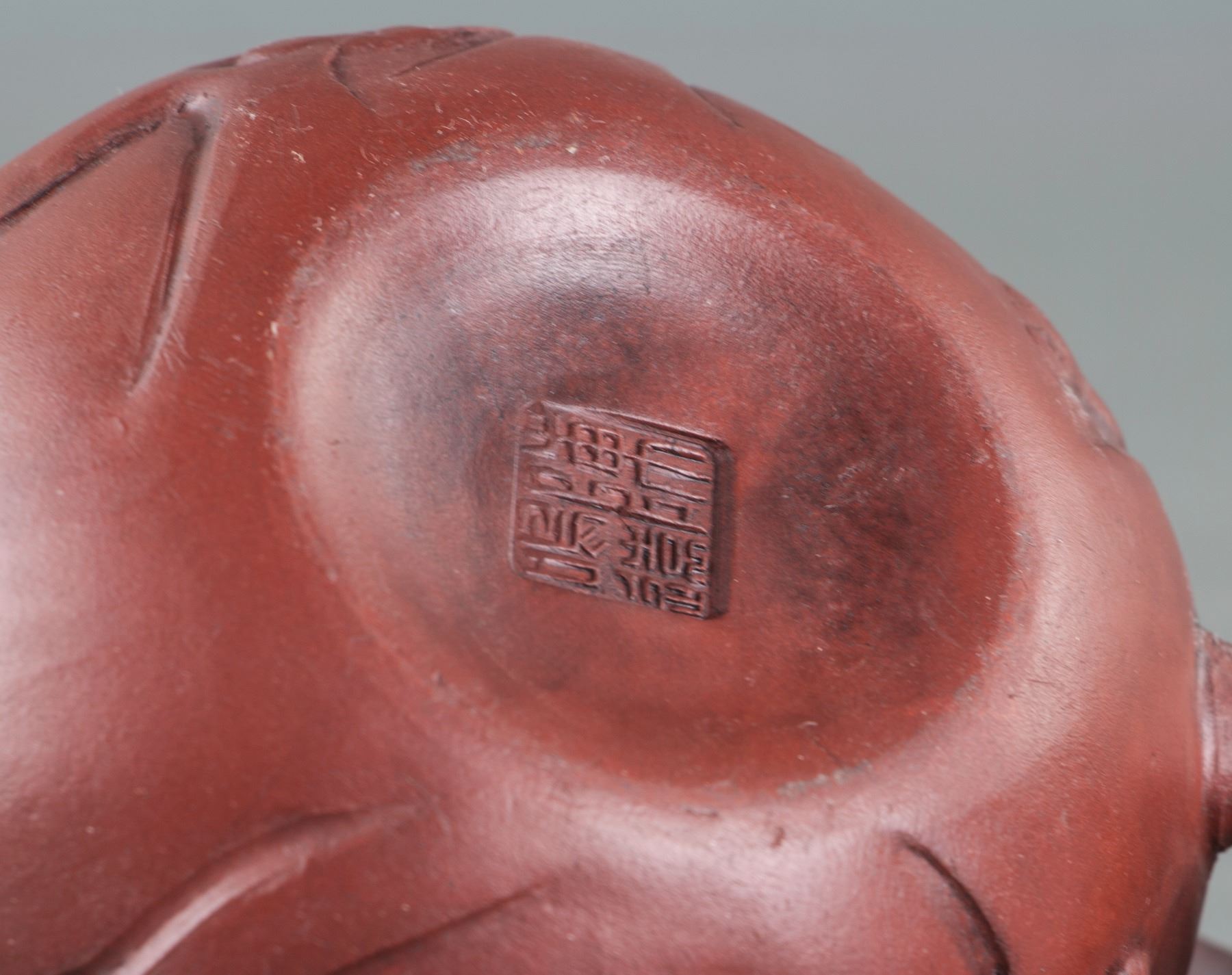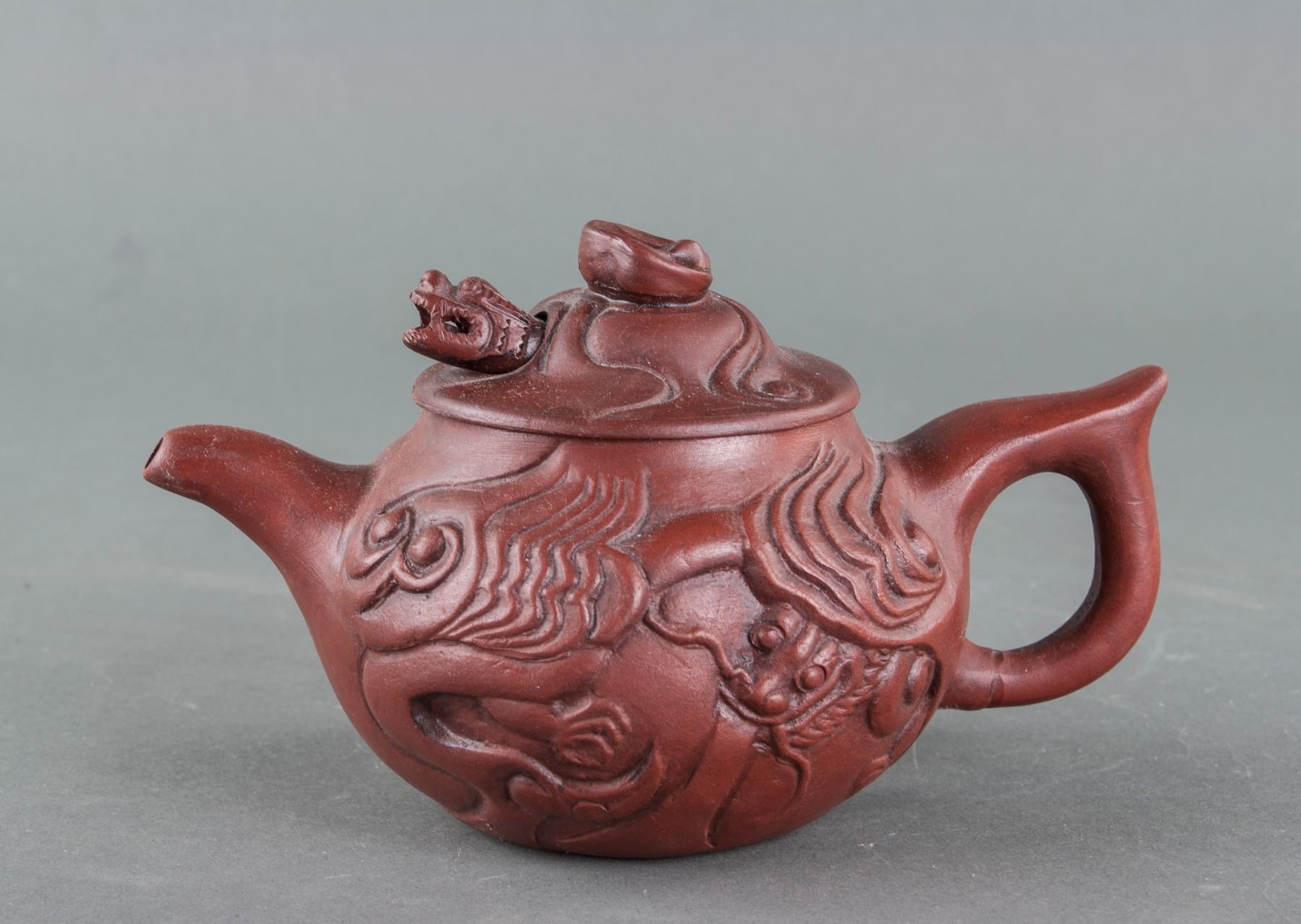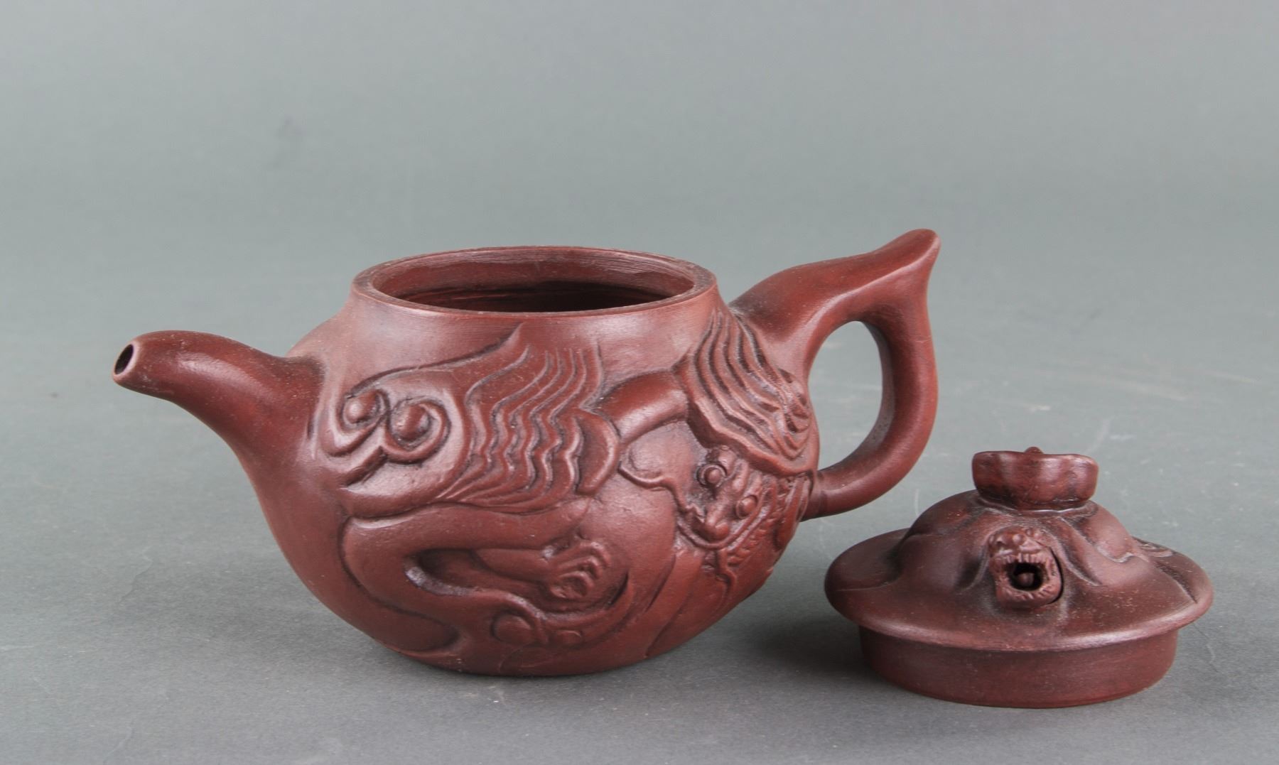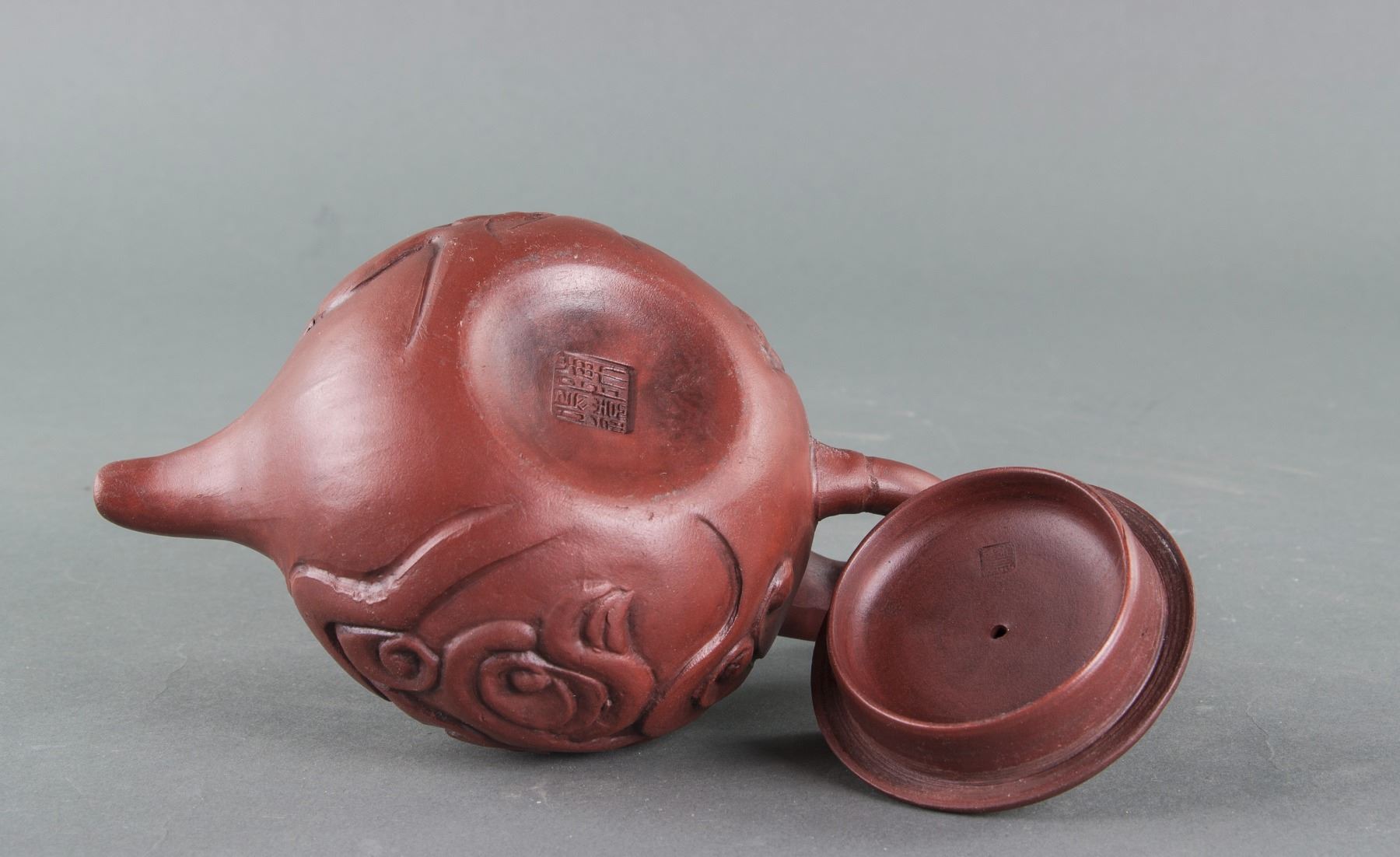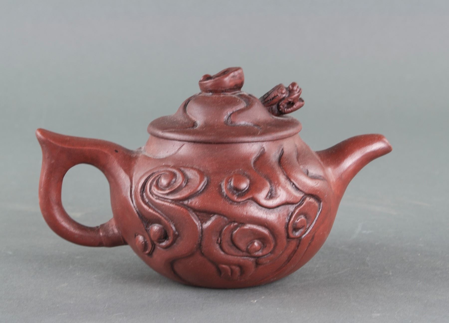 Chinese Zisha teapot; of globular body with cover; flanked with curved handle and short spout; cover carved with dragon head; decorated with cloud pattern carving; artist Chen Mingyuan mark on base; 11 cm x 17 cm, 420 grams