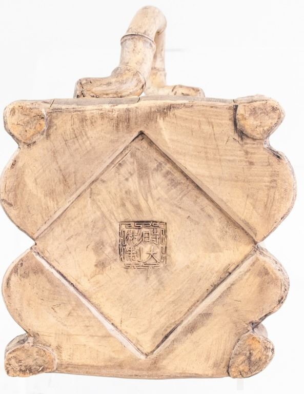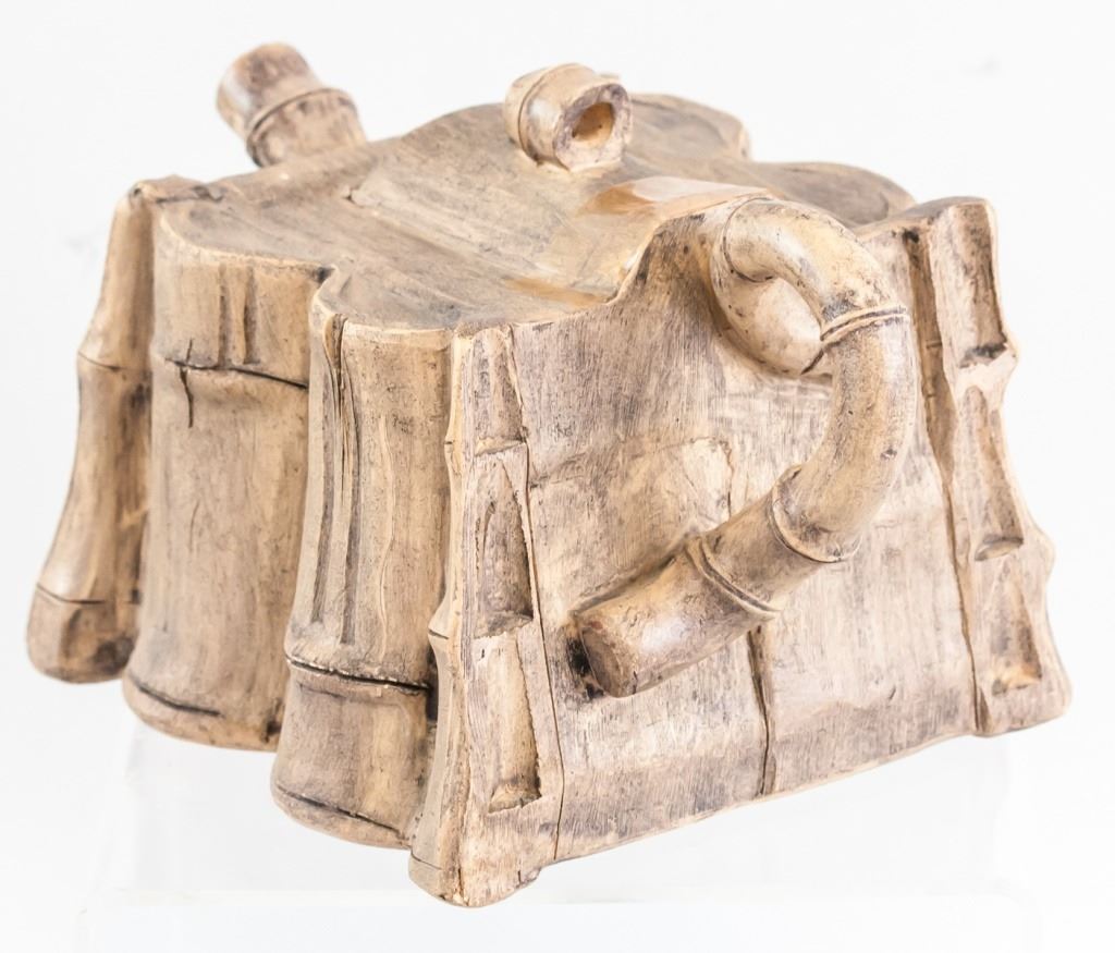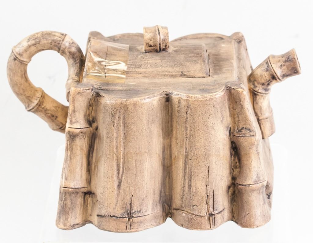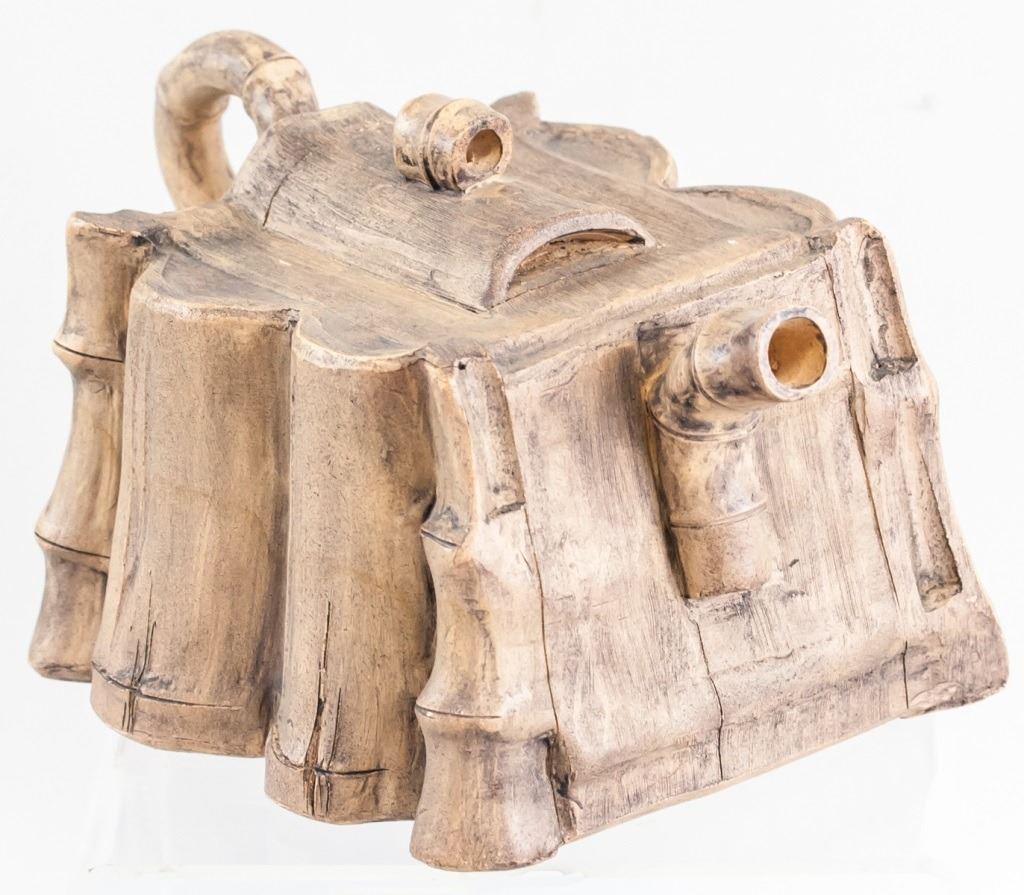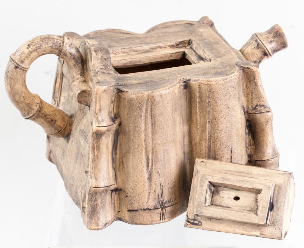 Chinese zisha teapot. In the shape of bamboo, with a square body. "Shi Da Shan Zhi" stamped on base. 11 x 16 cm. 435 grams.