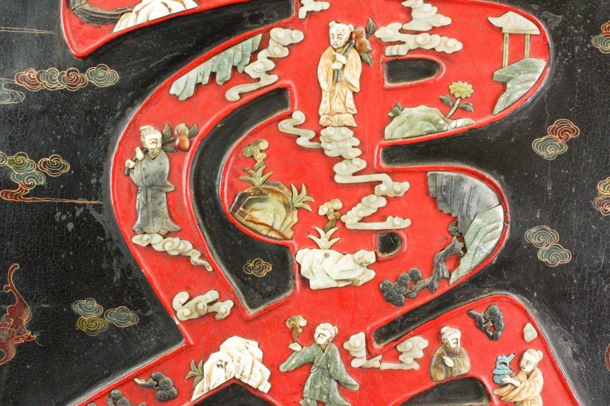 Chinese zitan wood screen; Qing period; of rectangular form with carved wood stand; featuring red-lacquered Shou character on front and gilt painting of landscape on back; with white hardstone and jade insets of immortals and cranes on front; 123 cm X 85 cm