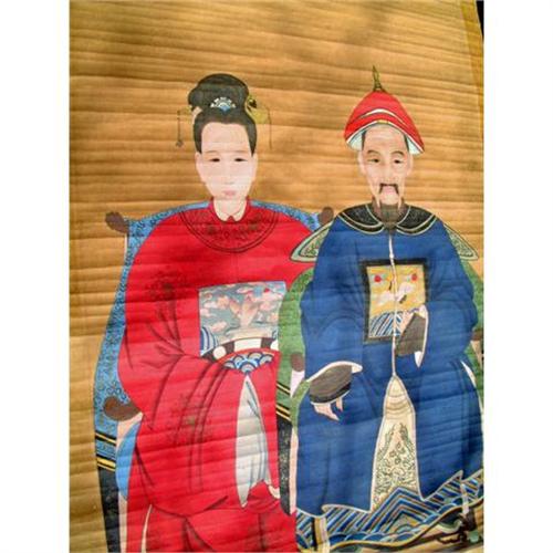 Chinese ancestor gouache painting on paper scroll representing a seated couple. Size: 80" X 43" (204 X 109 cm.).