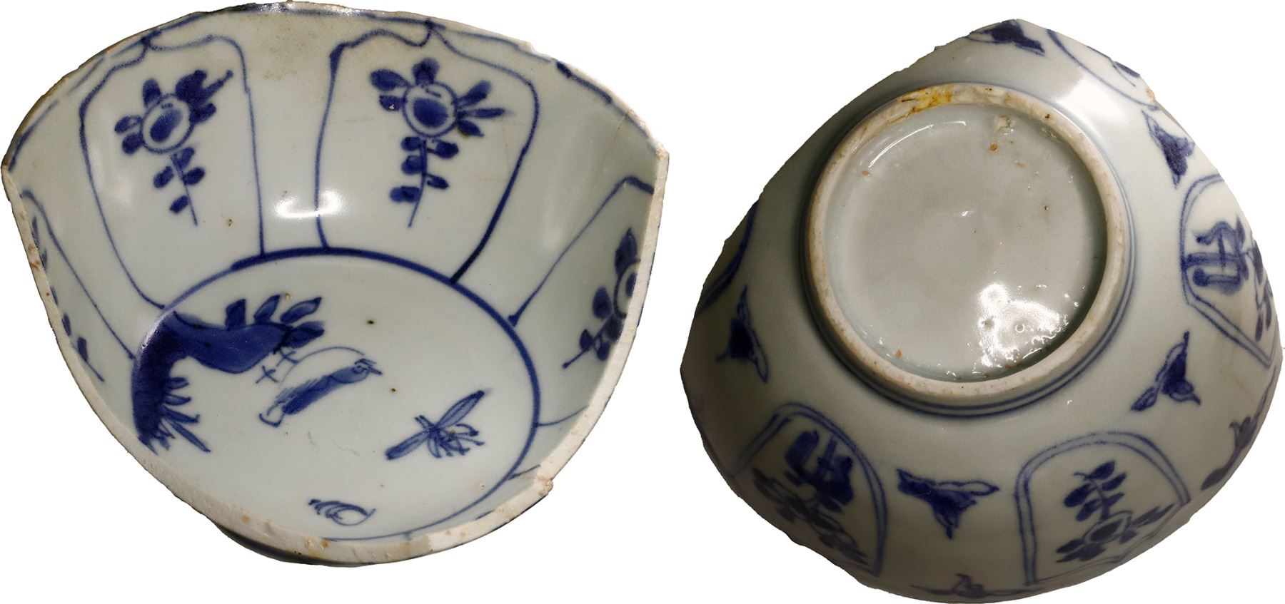 Chinese blue-on-white porcelain bowl fragment, Kangxi period, bird-on-leaf motif, ex-Concepción (164