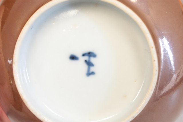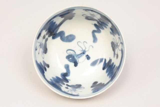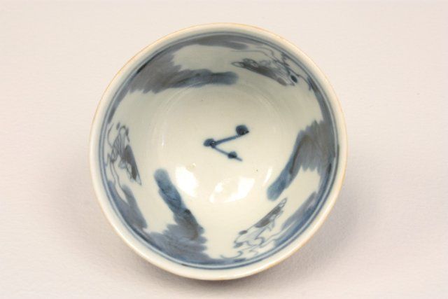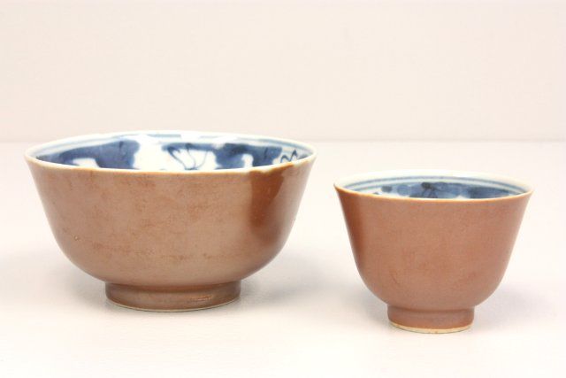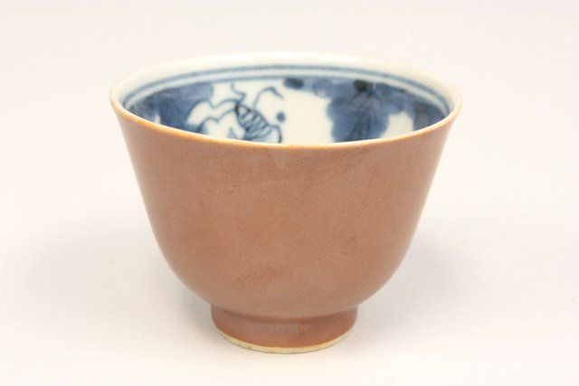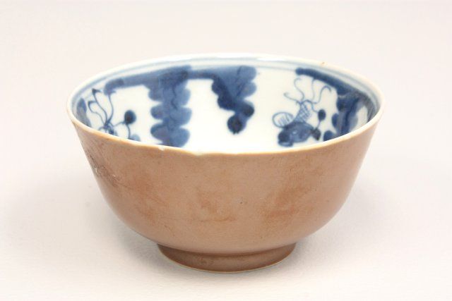 Interior with underglaze decoration of "Fish & Weeds" outside with coffe-au-lait glaze, Batavia ware, ca. 1740. Approx. 2.5" x 4.5" & 2.25" H. Please read our terms of sale.