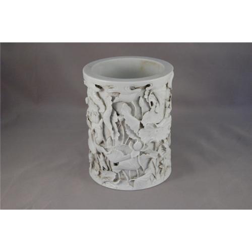 Chinese carved biscuit porcelain pen holder with mark.decor with lotus flowers around the pot.good condition.