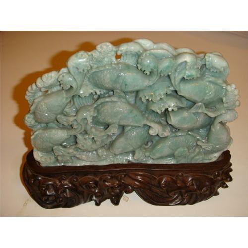 Chinese carved green jade Nine cyprinoid.excellent condition,size does not include the wooden base. the jade alone is 5 Lb 12 Oz.