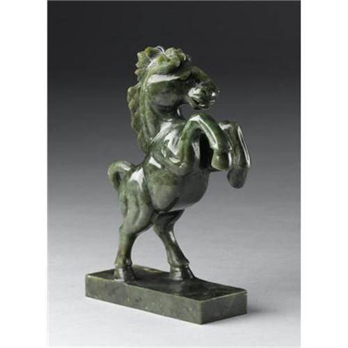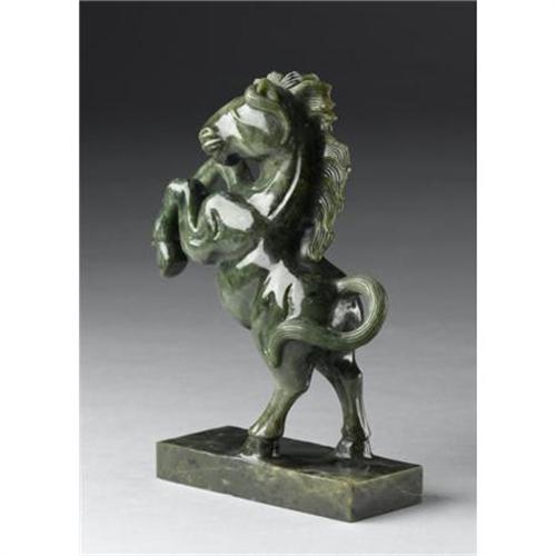 <B>Chinese Carved Jade/Hardstone Horse<BR></B></I><BR>Chinese carved jade/hardstone figure of a rampant horse with flowing tail and mane. Of dark green coloration<BR>8in. high<BR><BR> <B>Condition Report:</B> Tiny chips to base.<BR><BR><b>Shipping:</b> Miscellaneous Collectibles, Larg (<a target="_blank" href="http://www.heritageauctions.com/common/shipping.php">view shipping information</a>)