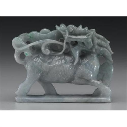 <B>Chinese Carved Jade/Hardstone Qilin<BR></B></I><BR>Chinese carved jade/hardstone openwork figure of a qilin and tael. Of pale green coloration<BR>4in. high<BR><BR> <B>Condition Report:</B> Minor cracking to front legs.<BR><BR><b>Shipping:</b> Miscellaneous Collectibles, Larg (<a target="_blank" href="http://www.heritageauctions.com/common/shipping.php">view shipping information</a>)
