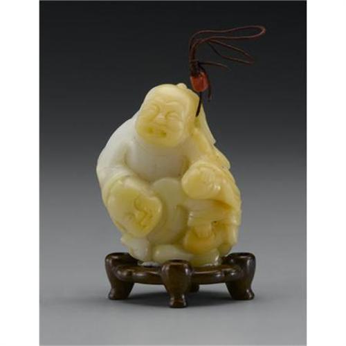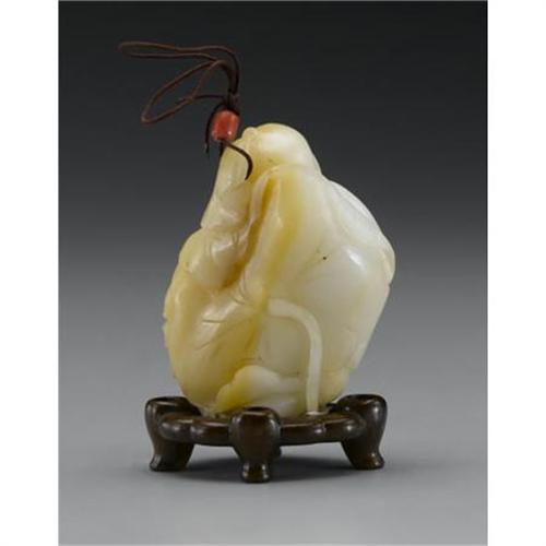 <B>Chinese Carved Jade/Hardstone Toggle<BR></B></I><BR>Chinese carved jade/hardstone toggle of two figures, one holding a peach and one holding the stem of a lotus frond. Of white coloration with yellow suffusions. With wood stand<BR>3in. high<BR><BR> <B>Condition Report:</B> Normal signs of wear as appropriate with age.<BR><BR><b>Shipping:</b> Miscellaneous Collectibles, Larg (<a target="_blank" href="http://www.heritageauctions.com/common/shipping.php">view shipping information</a>)