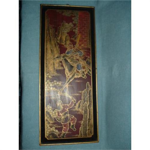 One of 2 lowere panels in a decorative Chinese door. Design depicts 2 battling warriors, 1 mounted, the other on foot. Original colors have been restored. Has a brass hang hook, 34"H x 13.75"W. The building was demolished C 1960