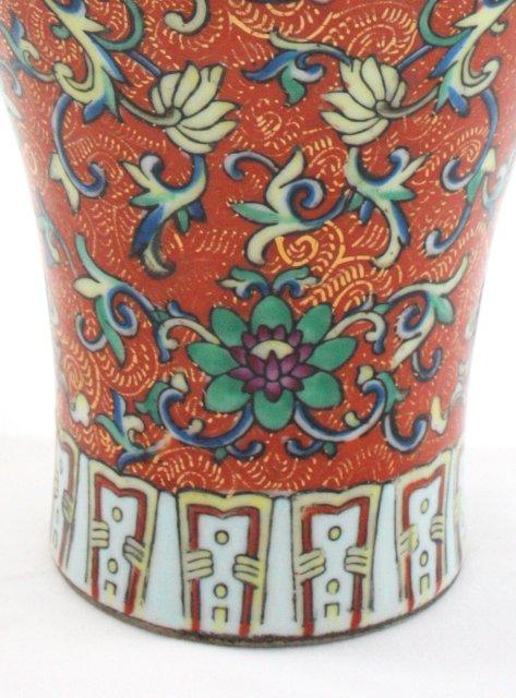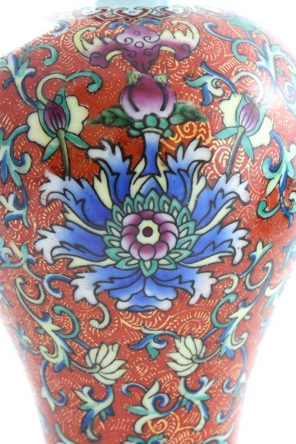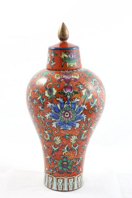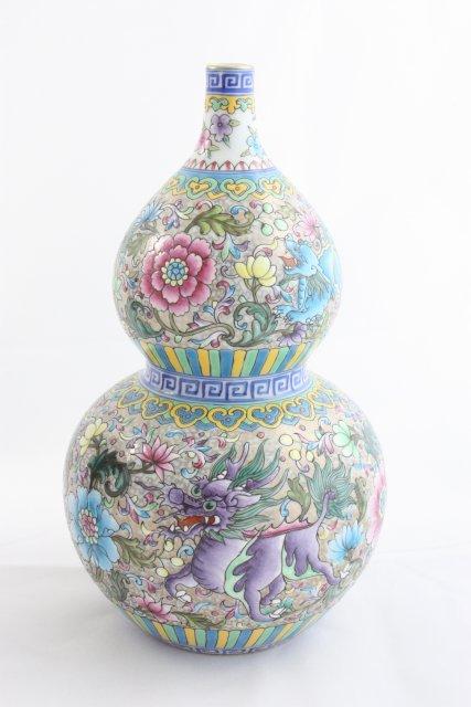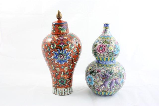1- double gourd vase is porcelain with floral, approx. 9" H. 1- Covered ginger jar is approx. 10.5" H. Both have Qing Long mark, late Qing period, early Republic. Please read our terms of sale.