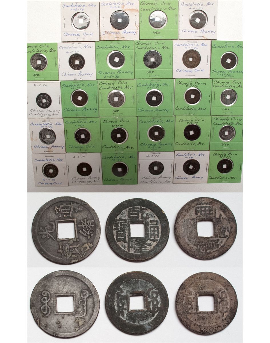 Lot of 31 different coins. Found by Leon Hubbard in Candelaria circa 1969. This is a classic archive of Chinese coins from the Chinese Community from the ghost mining town of Candelaria. On June 10, 1909 the Inyo Register reported that, "The old Chinese joints are gradually being torn down and being used for firewood." Great find, great history!City: CandelariaCounty: MineralState: NVDate:
