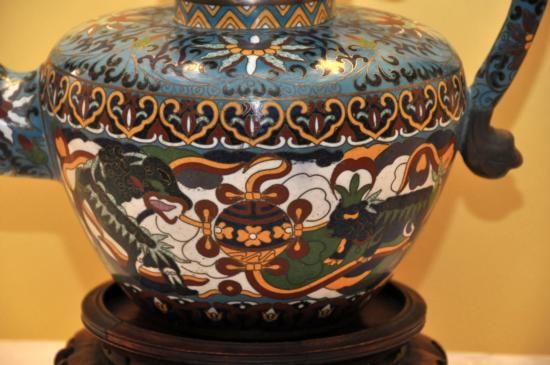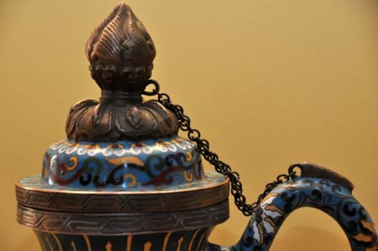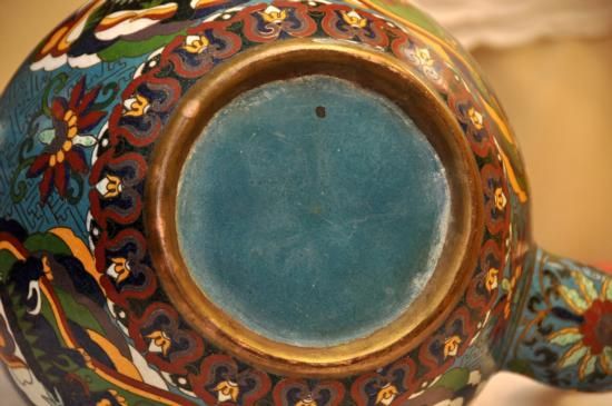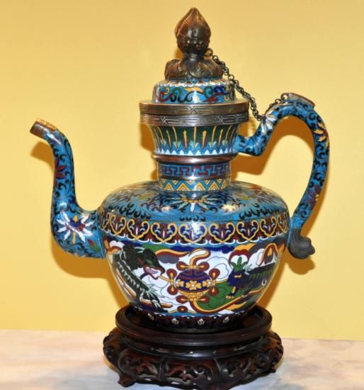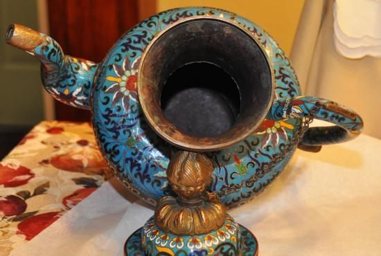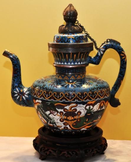 Normal 0 Large cloisonne/ enamel vessel/ kettle or ewer with bronzecover attached to base with chain. Bright colors. Around 13" wide and 13" tall. No losses or damage found. Patina.