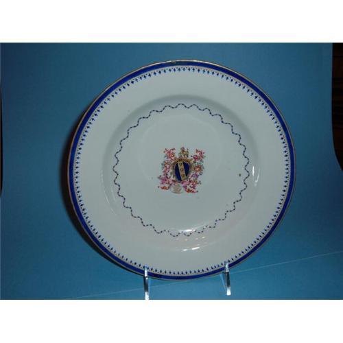 A Chinese export porcelain deep dish or soup plate. The rim is painted in a rich bleu de roi with pendant fleur de lis, a rope well circlet in blue and gold enclosing the fine enameled crest and coat of arms of General Stevenson, Governor of Fort St. George, Madras. The ancestral home of this famous family was Bardfield Hall, Essex. King Lung period. 9 3/4" diameter