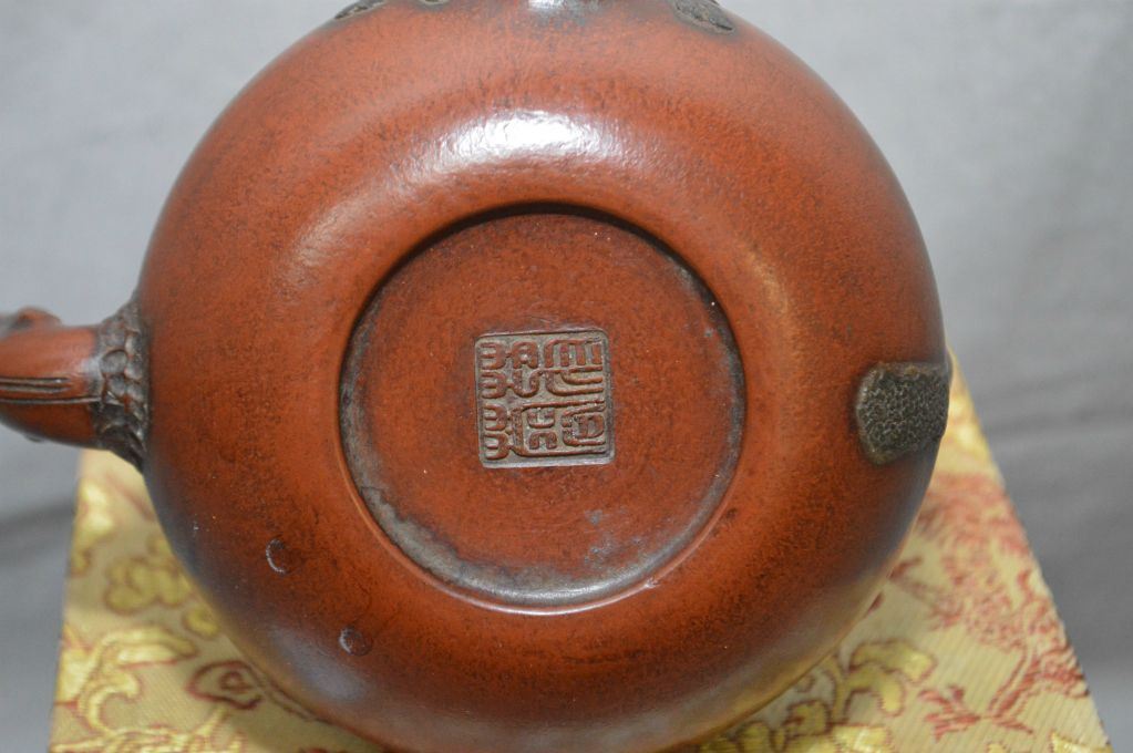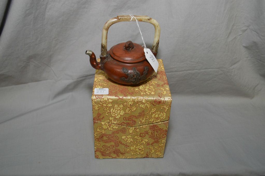 Chinese jade handled signatured purple clay teapot, circa late 19th, early 20th century