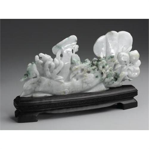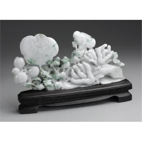 <B>Chinese Jade Openwork Carving </B></I><BR><BR>Chinese jade openwork carving of ruyi fungus, peaches, and "Buddha's Hand," together with certification of gem identification. Of pale green coloration with dark green suffusion. On a wood stand<BR>11 inches long<BR><BR>Provenance:<BR>From the Peter Apple Jade Collection<BR> <B>Condition Report:</B> Normal signs of wear as appropriate with age.<BR><BR><b>Shipping:</b> Miscellaneous Collectibles, Larg (<a target="_blank" href="http://www.heritageauctions.com/common/shipping.php">view shipping information</a>)<BR><BR><B>Important notice:<