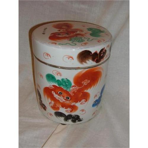 Chinese export jar with lid decorated with orange Pekinese, surrounded by other smaller mythical animals and Chinese letters. 7 1/4" diameter.
