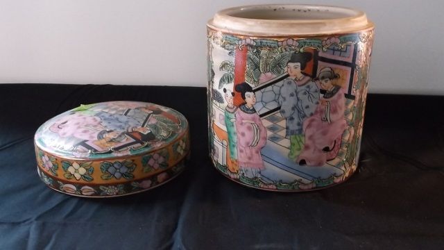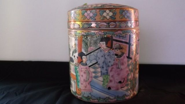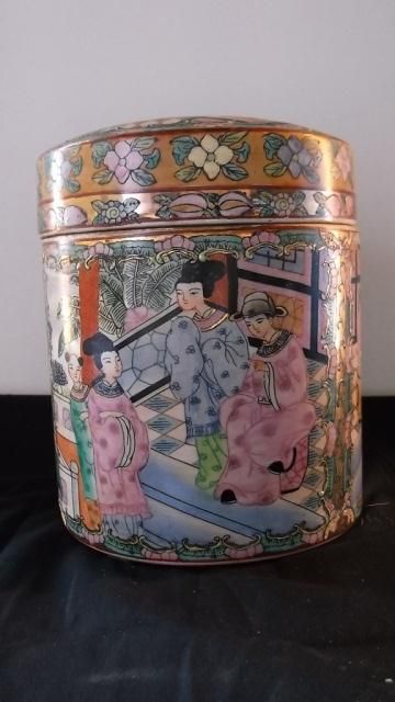 Chinese porcelain lidded jar with elaborate scenic decoration approx 5" Round x 7" Tall