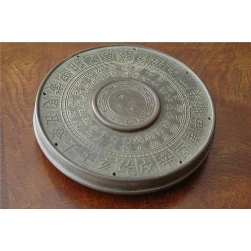 Chinese Yixing pottery vessel with removable center and with moulded characters and yin/yang symbol, seal mark;8 1/2" D. Good condition.