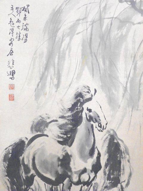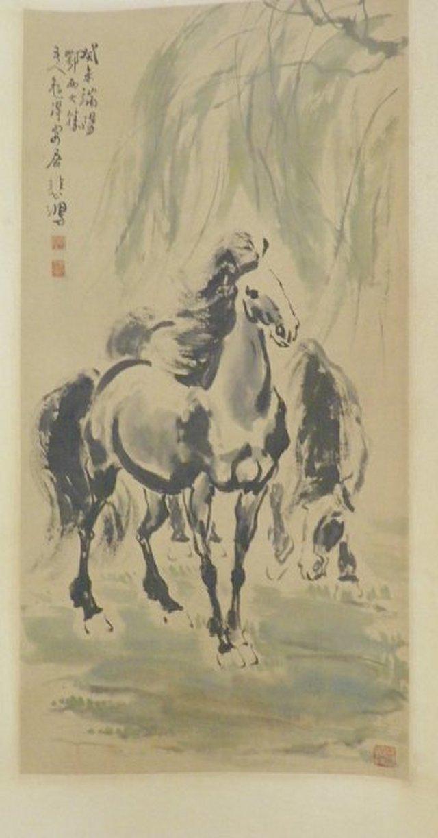 Chinese scroll artist signed "Bei Hong" "2 Horses"