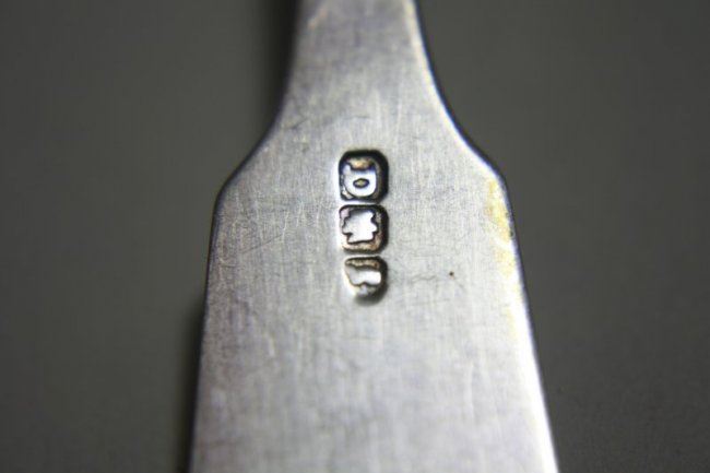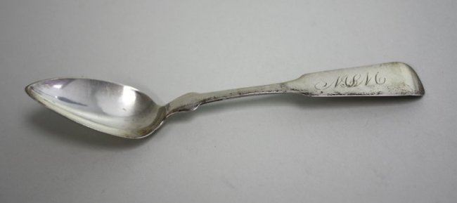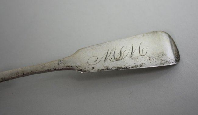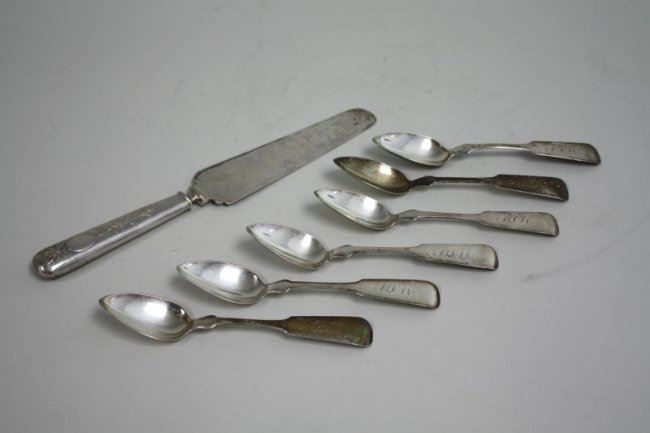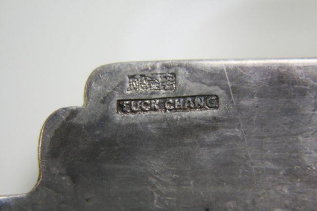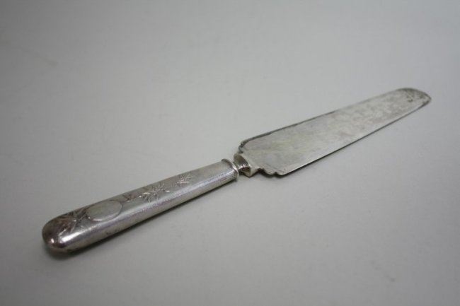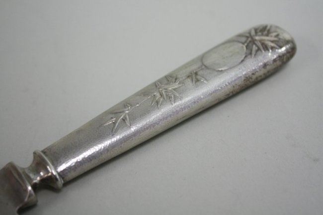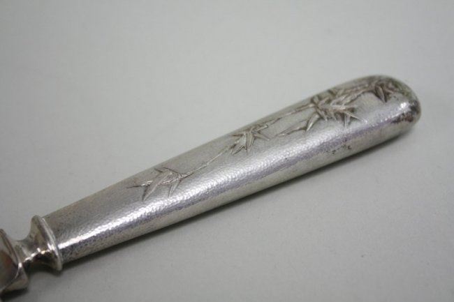 Chinese serving piece Hallmarked. Spoons monogrammed. Knife approx. 3.21 ozt, spoons approx. 2.88 ozt. Approx. 6.085 ozt total.