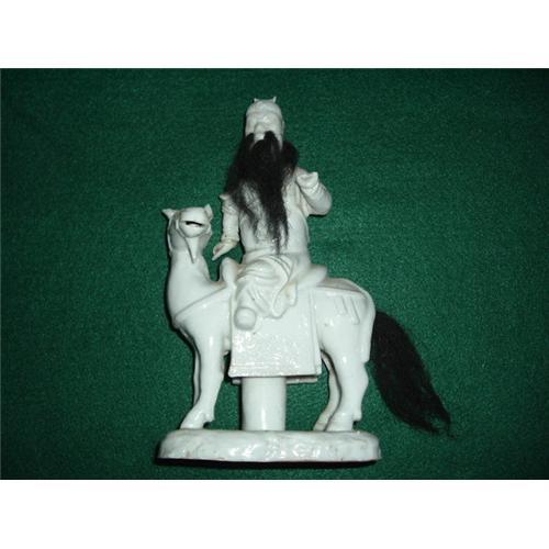 This is Kuan Yu (or Kuan Kung), the Chinese Mars, the God of War. Kuan Yu is perhaps the most popular of all the Chinese divinities. He is the patron saint of various trades and professions. This white porcelain statue riding a horse on a stand. With the stand 5 1/2"W x 3"D x 9 1/2"H. Some chips.