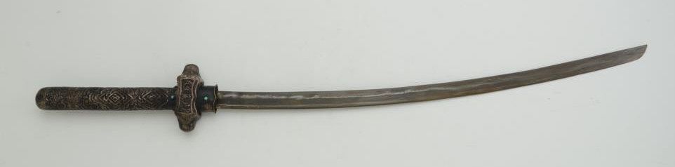 Chinese sword and scabbard from Manchuria or Tibet in style, 19th to 20th Century, approx. 38” overall with decorative appearance and multi-stone encrusted; plain blade, braided hanger. Est.: $200-$400.