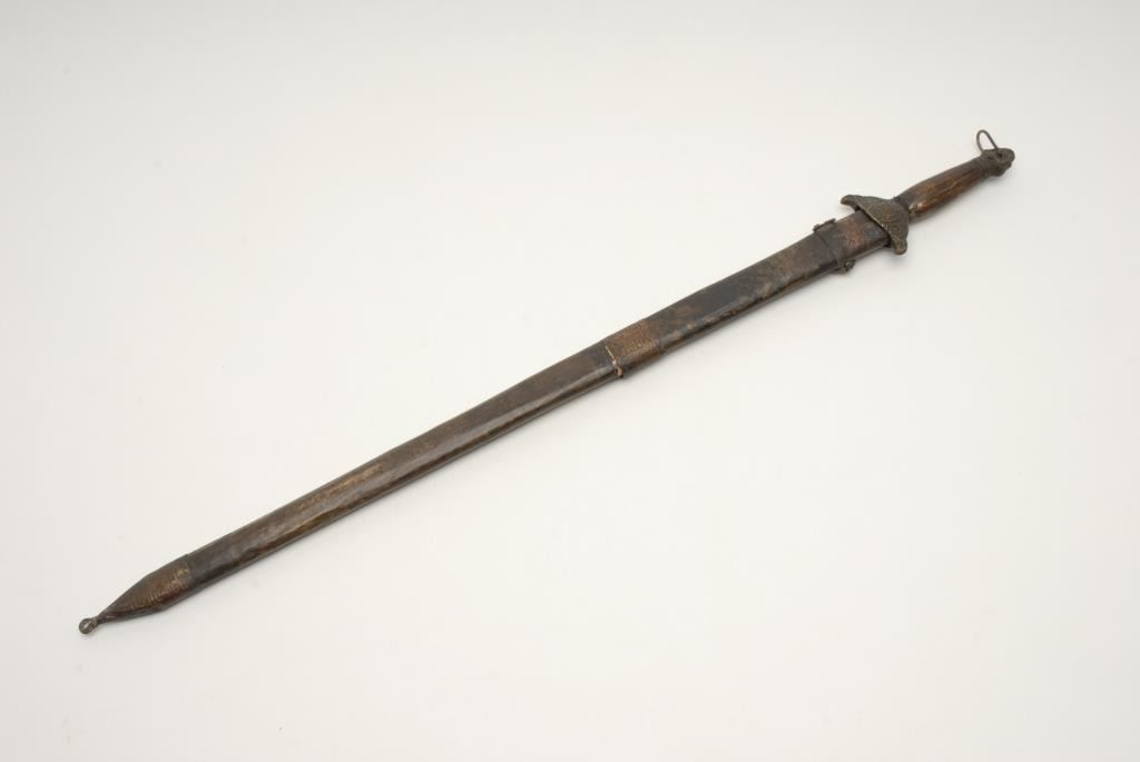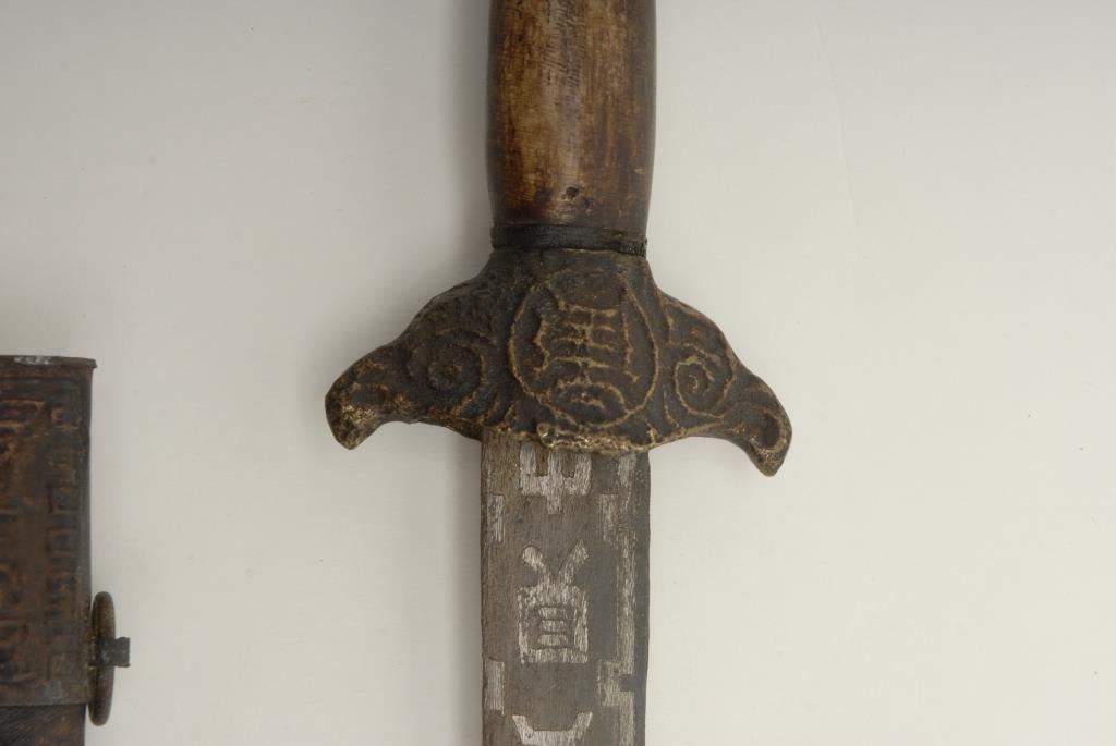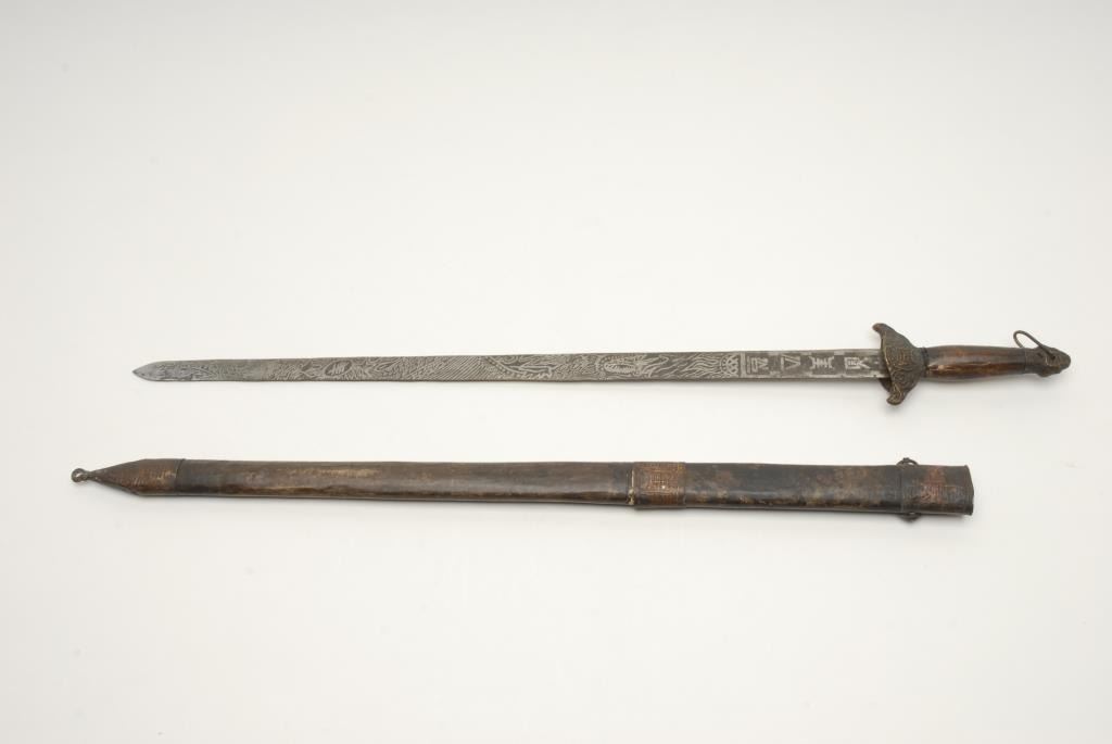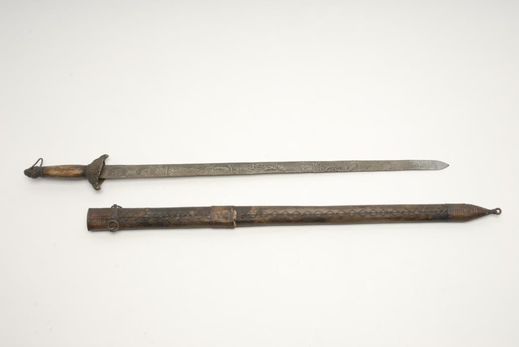 Chinese sword with scabbard showing etched blade circa 19th century. Measures 35” overall with a 30” blade. In good condition. Purportedly brought to San Francisco after Boxer Rebellion. Est.: $600-$1200
