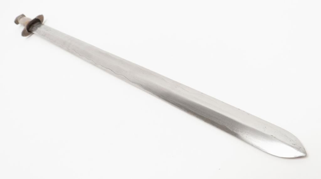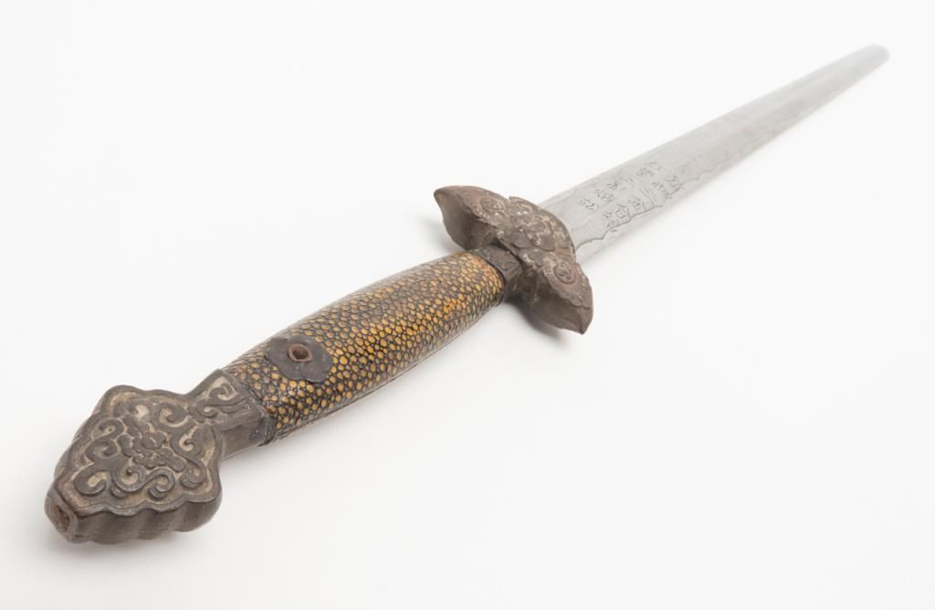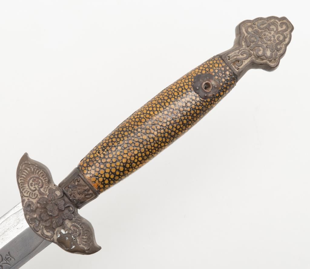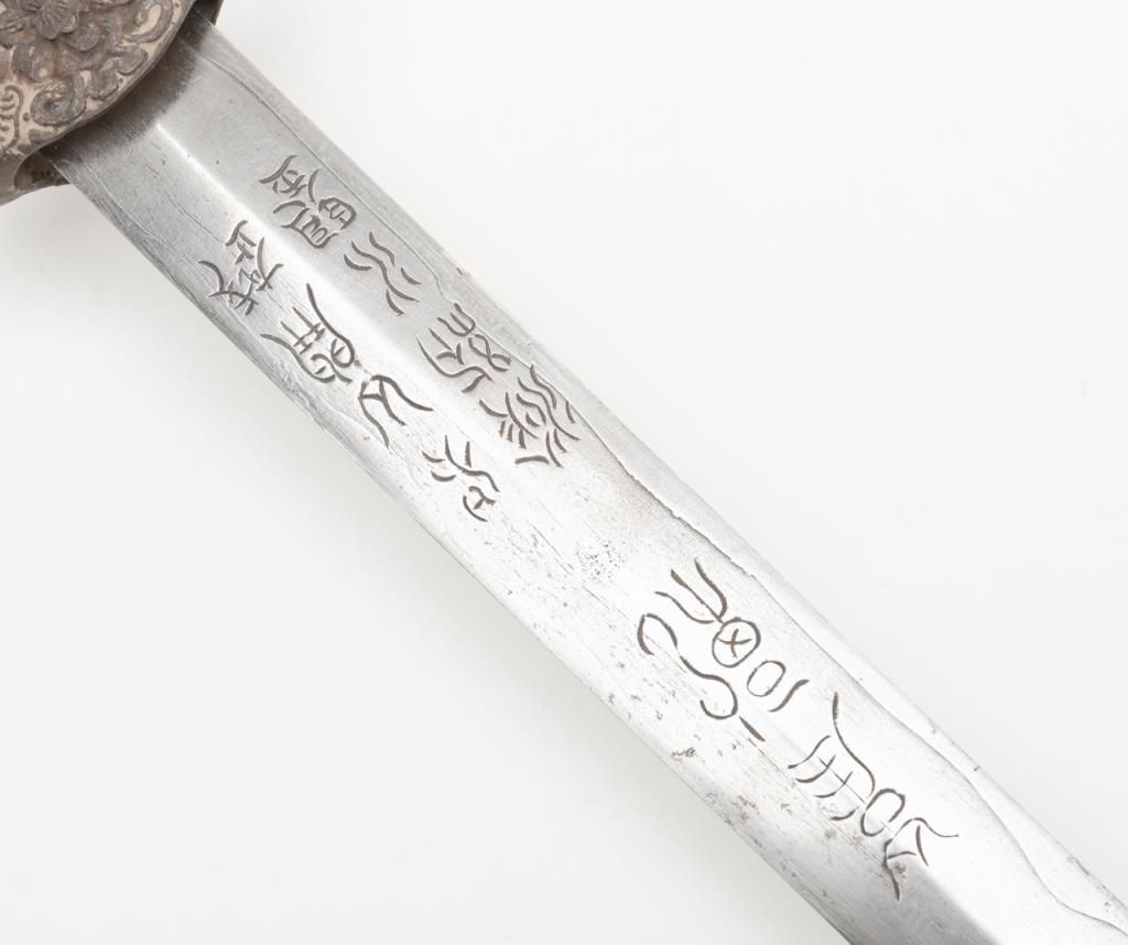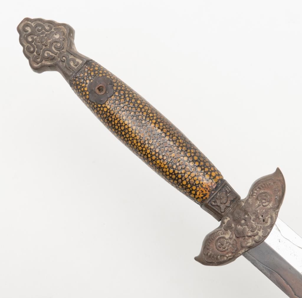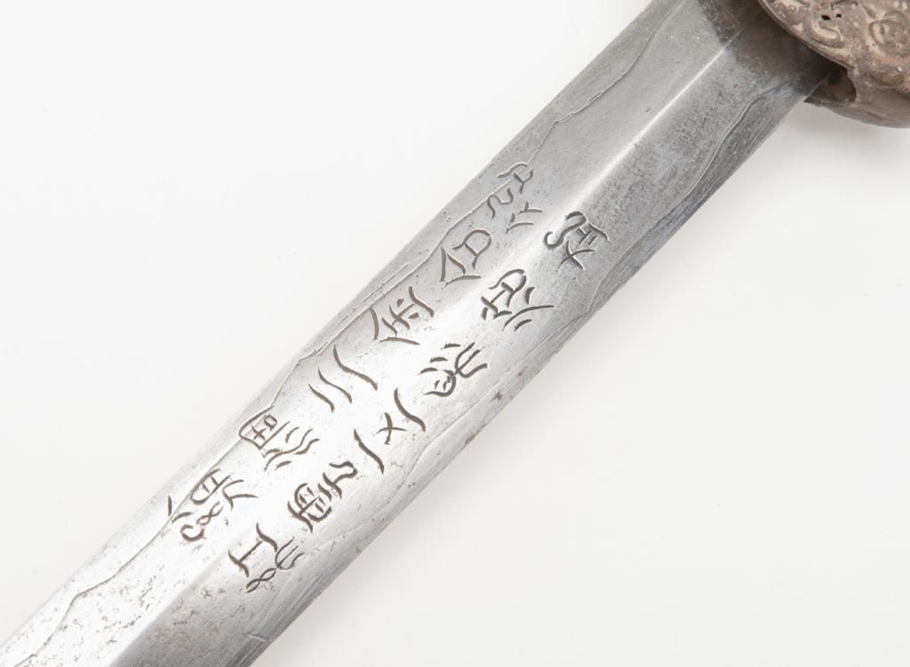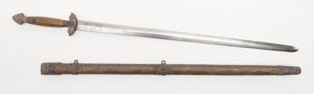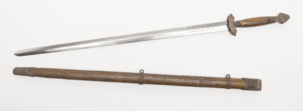 Chinese sword with sharkskin mounted grip and scabbard showing ornate cast brass mounts with well forged blade showing a slight pattern in the steel with full Chinese signatures on each side. The sword measures 43 ¾” over all with a 34 ½”blade. The blade condition is very good and the scabbard is fair to good with some small losses and normal aging and a dark patina on the mounts. The age is 100 to 200 years old in our estimation. Est.: $750-$1500