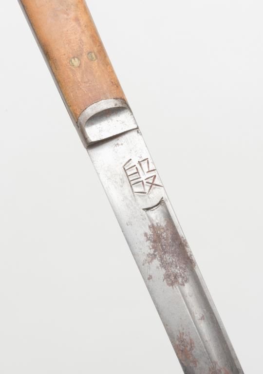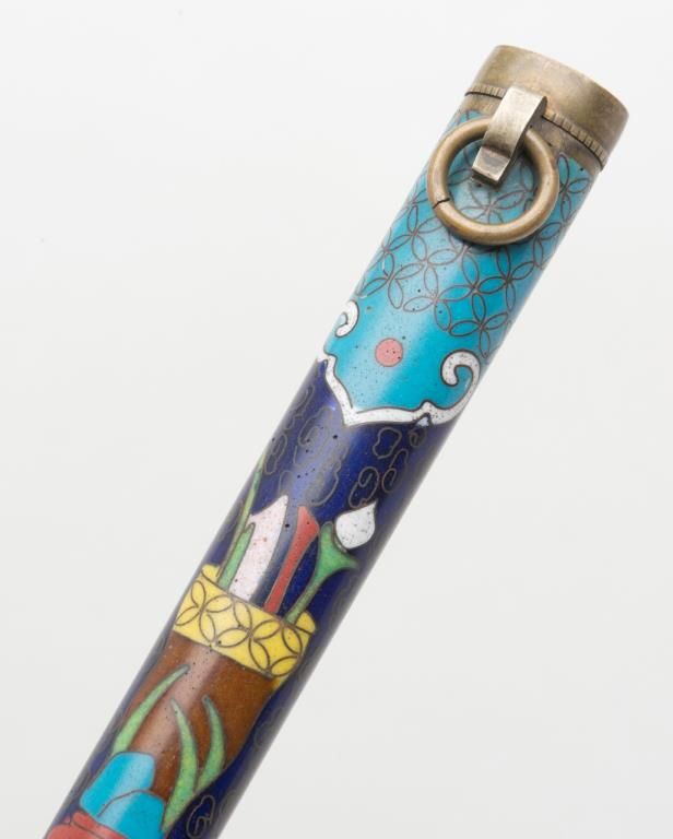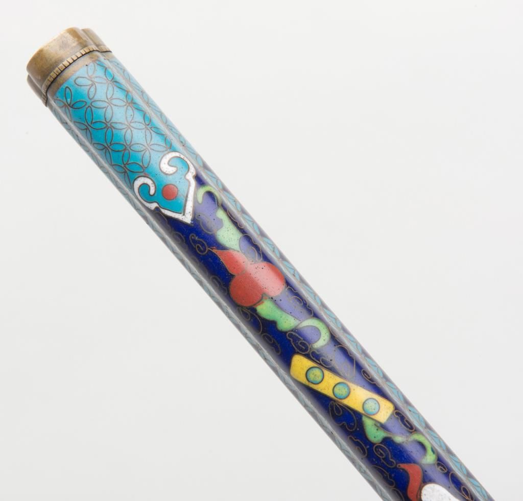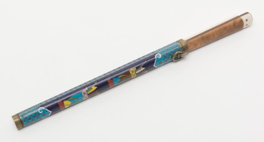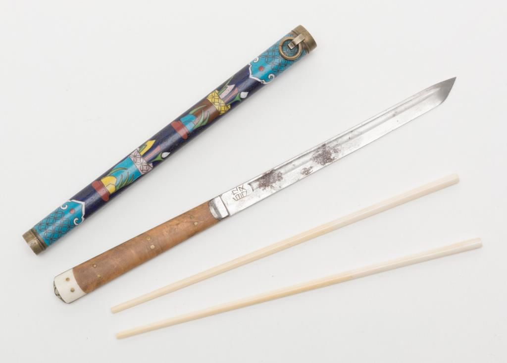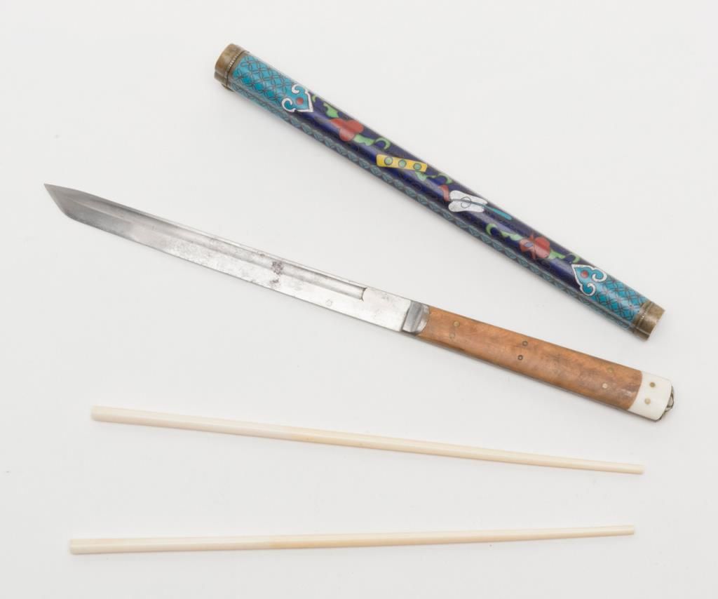 Chinese trousse with good quality forged steel knife blade showing signature and fancy cloisonné scabbard with bone chopsticks. The knife grip is constructed of wood with bone accent and the knife measures 11” overall with a 6 5/8” blade. Thescabbard is in very good to near fine condition with high quality cloisonné showing no damage. The condition is near fine overall and we would date to the 19th-century and was probably the is property of a noble due to the high quality Est.:$600-$1200