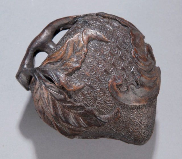 A Chinese wood carved peach form box with bats and flora carved in relief. 20th century. 3"h x 4 1/2"w x 3 3/4"d.
