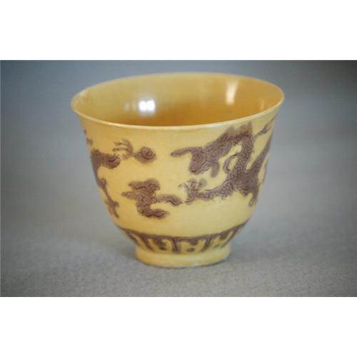 Chinese yallow glazed porcelain cup with mark. decor with dragon design.minor wear.
