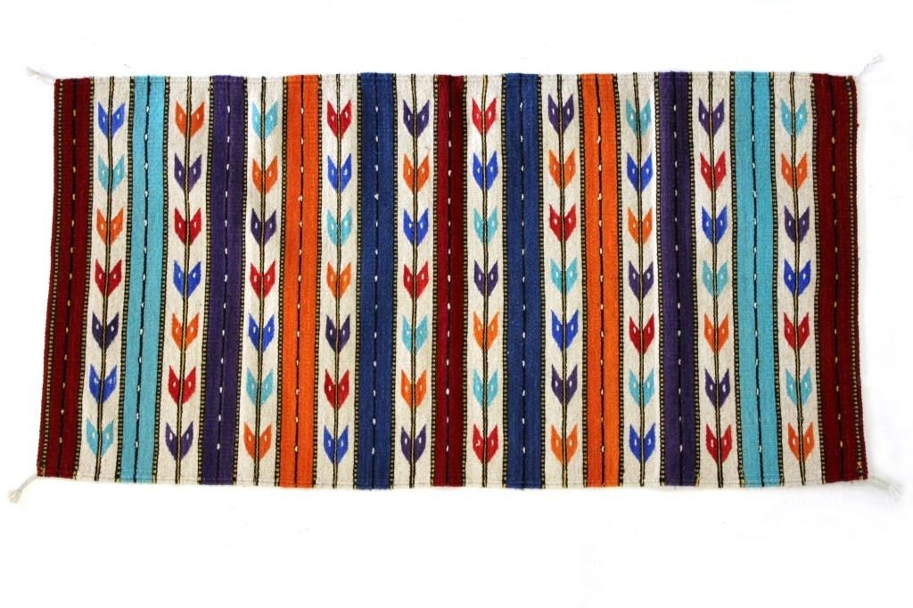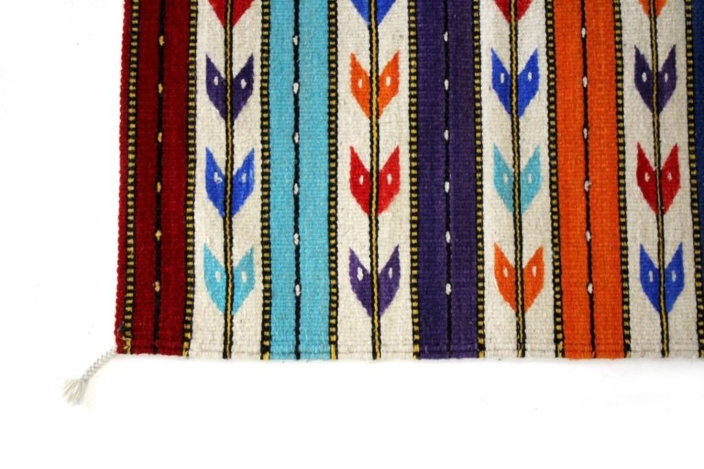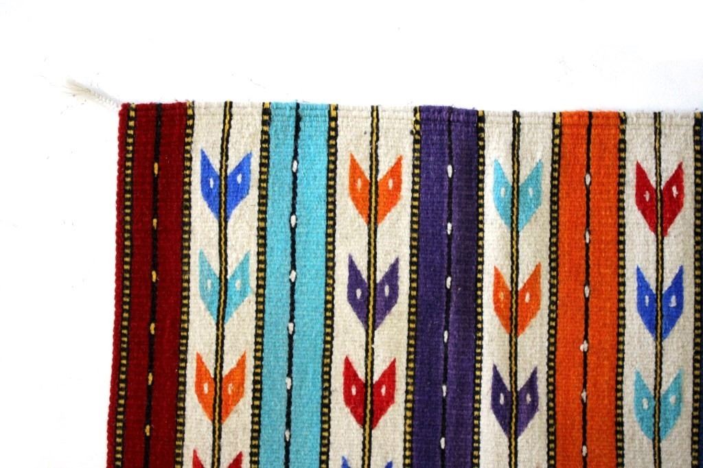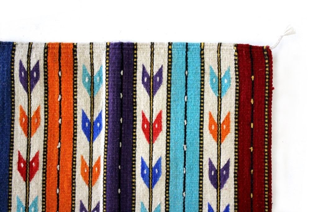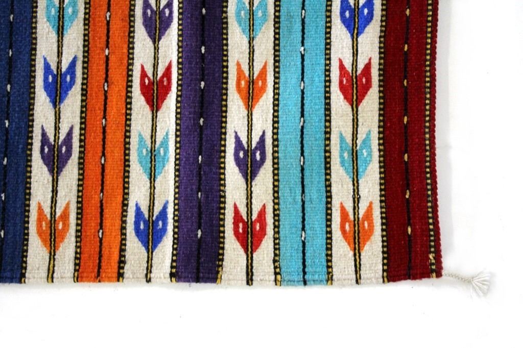 This is an excellent, handwoven, flat weave rug by master weaver Fidel Lopez. It was made using 100% soft, fine, handspun yarns in a beautiful Chinle Banded Flechas pattern. The rug was handwoven with a tight weave using 100% handspun wool yarns that offer natural variegation and durability with color fast aniline dyes. The tight, handwoven weave displays the bright, rich tones in the fine Chinle Banded Flechas pattern in the time-honored Zapotec, multi-generational craft by a master weaver, Fidel Lopez. The rug shows a wonderful contemporary rendition of a banded Chinle, with multi-colored bands of fletching and wire decorated bands of red, light blue, dark blue, purple, and orange. The fletching decoration is colored similarly. The piece is brand new, in pristine, condition with a tight weave. The rug measures 2’ 5” by 5’ (2 foot 5 inch by 5 foot). This is a brand-new rug.