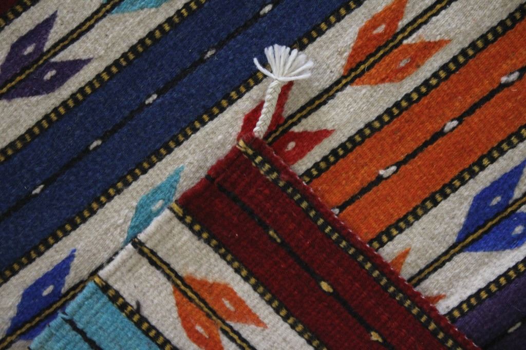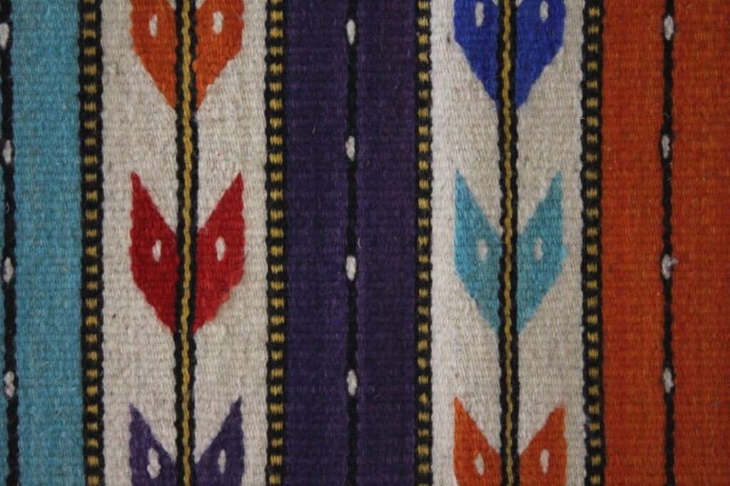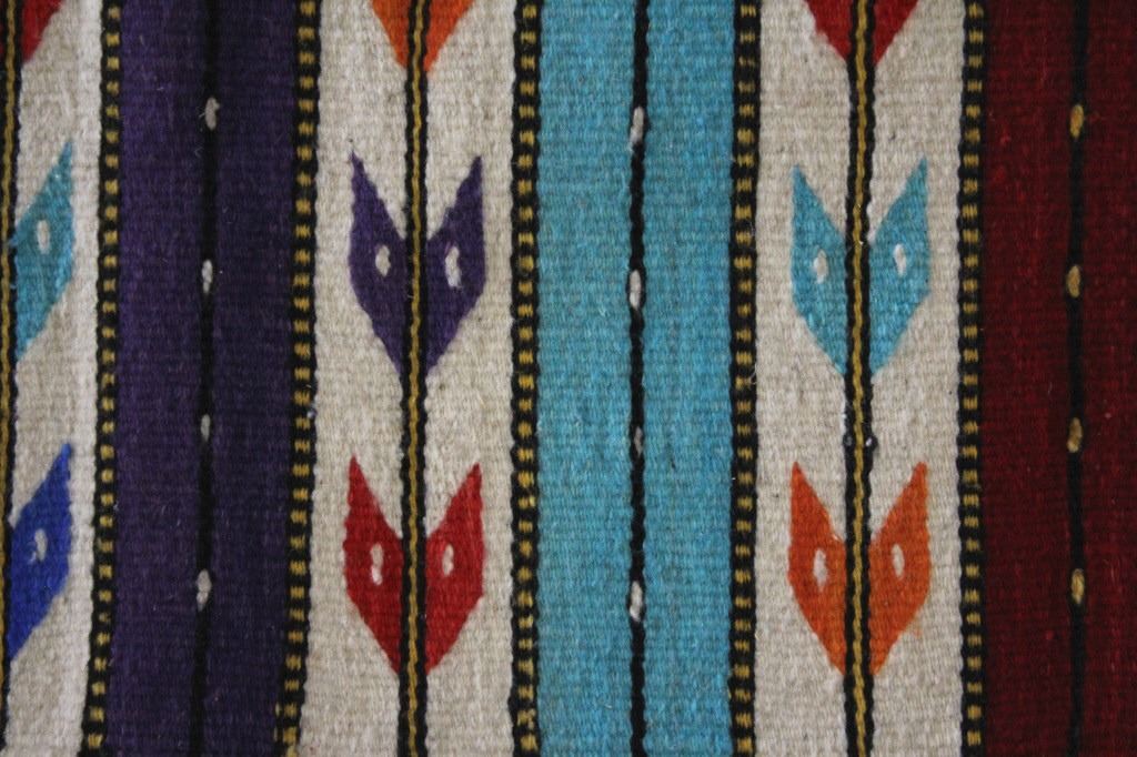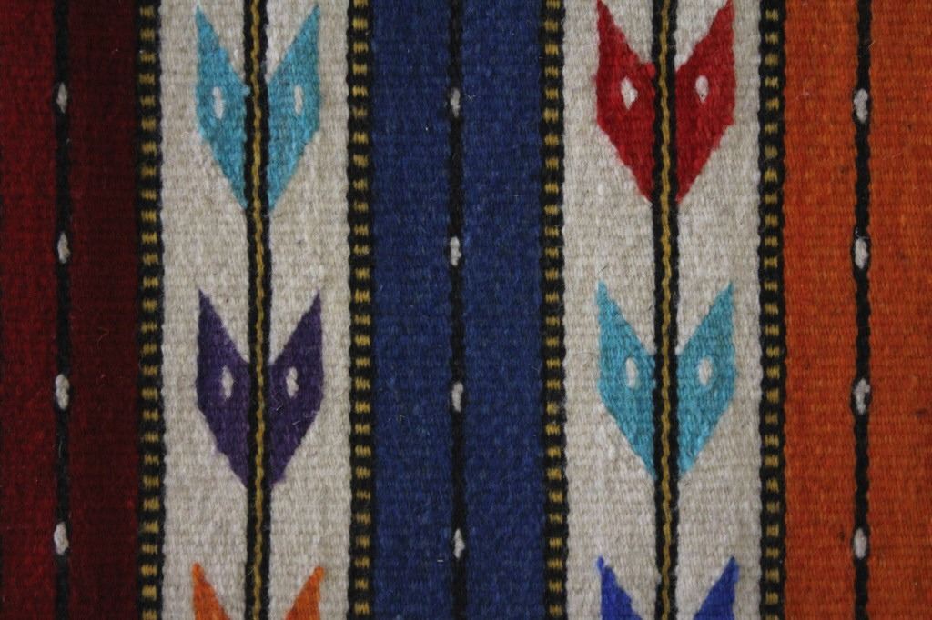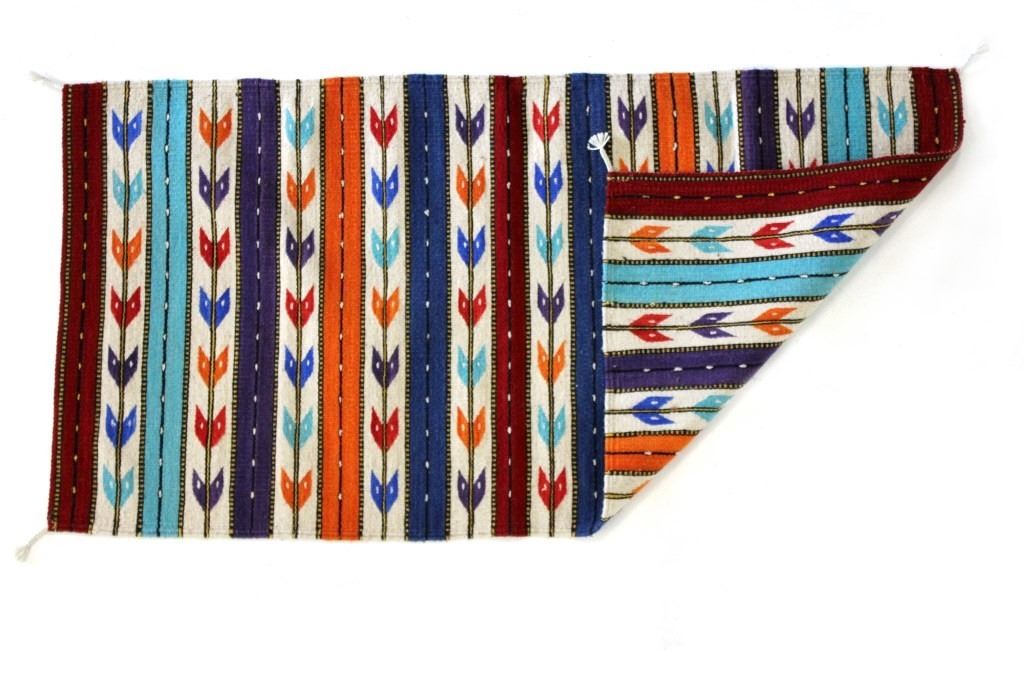 This is an excellent, handwoven, flat weave rug by master weaver Fidel Lopez. It was made using 100% soft, fine, handspun yarns in a beautiful Chinle Banded Flechas pattern. The rug was handwoven with a tight weave using 100% handspun wool yarns that offer natural variegation and durability with color fast aniline dyes. The tight, handwoven weave displays the bright, rich tones in the fine Chinle Banded Flechas pattern in the time-honored Zapotec, multi-generational craft by a master weaver, Fidel Lopez. The rug shows a wonderful contemporary rendition of a banded Chinle, with multi-colored bands of fletching and wire decorated bands of red, light blue, dark blue, purple, and orange. The fletching decoration is colored similarly. The piece is brand new, in pristine, condition with a tight weave. The rug measures 2’ 5” by 5’ (2 foot 5 inch by 5 foot). This is a brand-new rug.