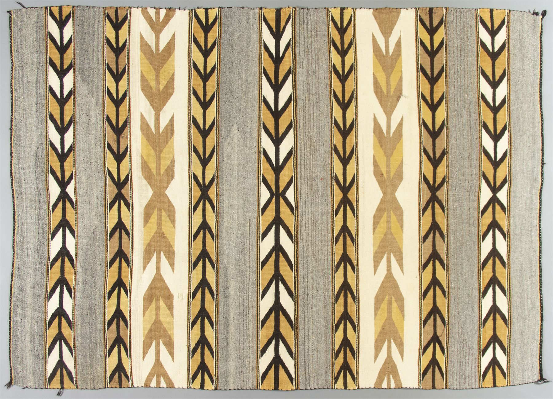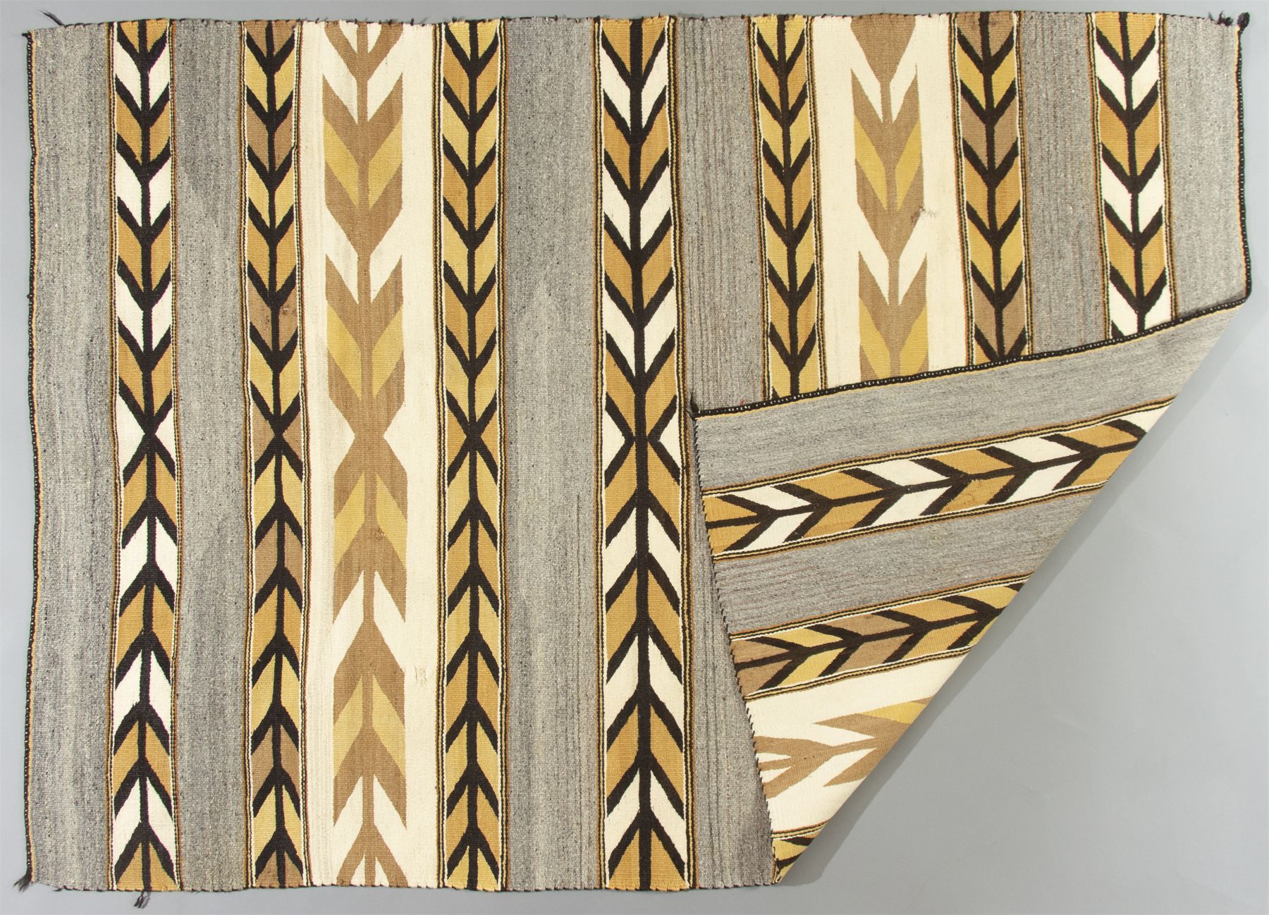 Chinle Navajo rug is made of all handspun wools, natural and aniline dyes in a banded pattern reminiscent of classic period blankets, but in a textbook Chinle color palette.