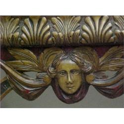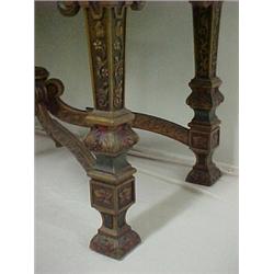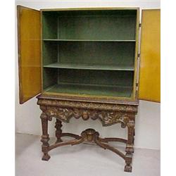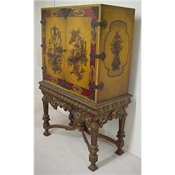 Chinoiserie decorated cabinet on stand, double doors with ornate brass handware open to expose painted interior with two shelves, on attached gilt decorated base with ornate pierced apron having center mask design, cross stretcher base, on square feet, C.1920, measures 65" high x 40" across x 22 1/2" deep Estimate 800/1400