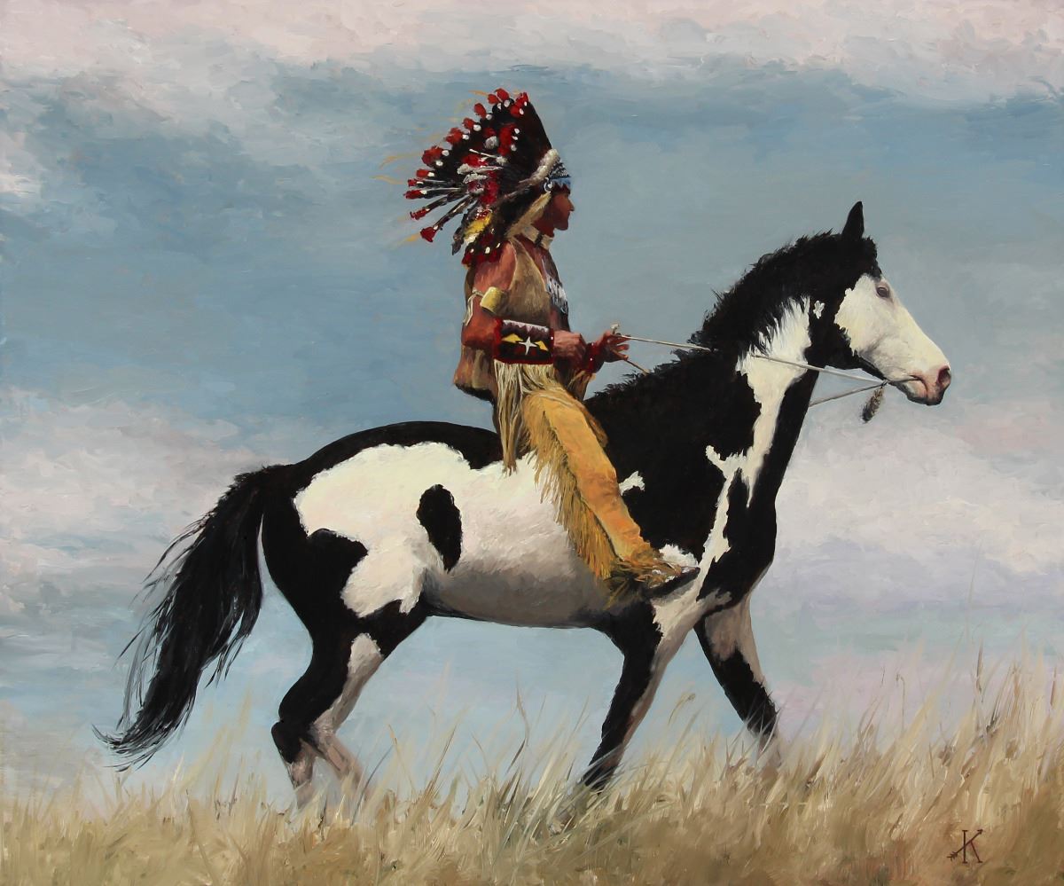 Artist: Kim Randleas. Title: Chinook. Medium: Oil. Size: 30" x 36". Framed size (if applicable): N/A Artist's description: While this in an iconic image of a Native American in traditional regalia, it is certainly much more. The subjects of the painting, Bryson Bronson and his horse Chinook have been ambassadors for the World Famous Pendleton Round-Up and Happy Canyon Indian Pageant and Wild West Show for many years. The two perform with only a war bridle, Bronson riding bareback up a two story set during the show. Bronson and Chinook have also been honored with leading the Rose Parade in Portland, Oregon in 2015 as well as presenting the colors for the opening ceremony at the 2015 NFR in Las Vegas, NV.